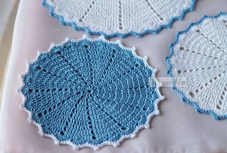 Комплект выполнен из пряжи Коко (белая) и Пехорка Ажурная (голубая). Крючок № 1,5. Диаметр большой салфетки 19 см, маленьких - 14 см.