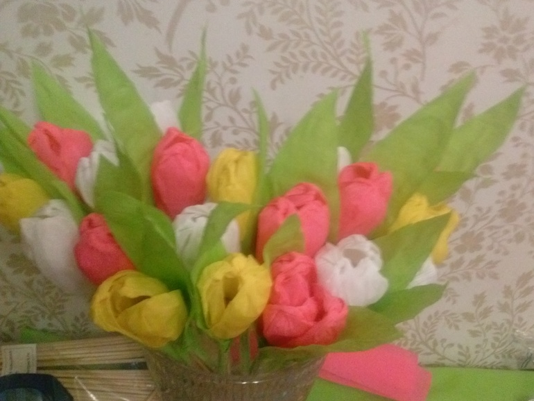 И тюльпаны из обычной гофрированной бумаги.они еще не оформлены в букет..