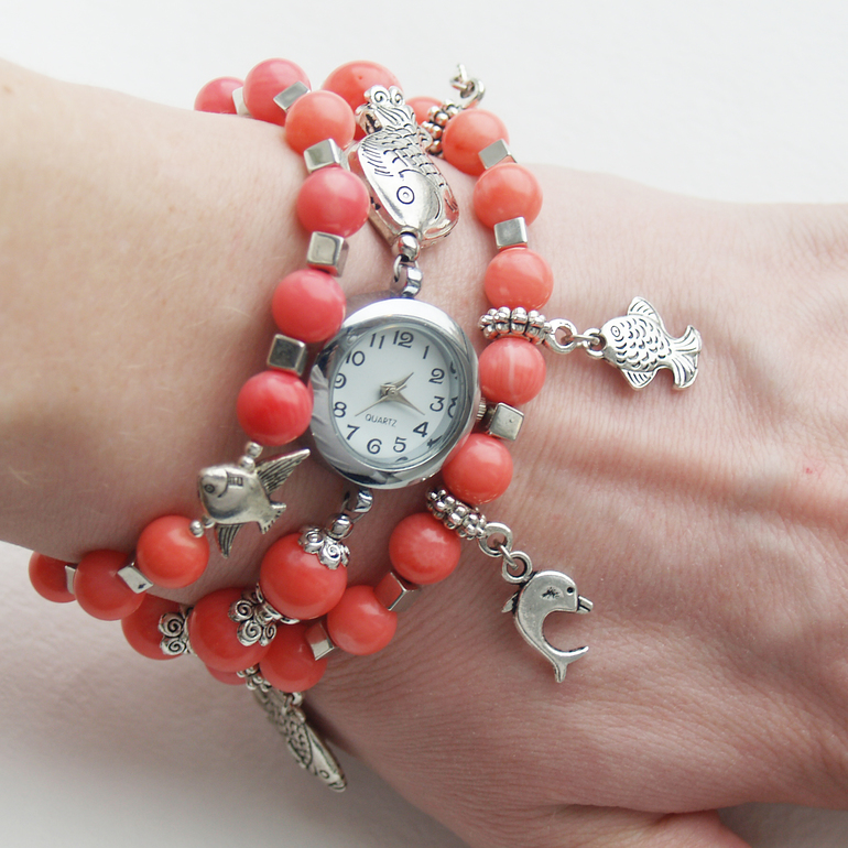 Часы сораны из трех нитей коралла и украшены милыми рыбками.