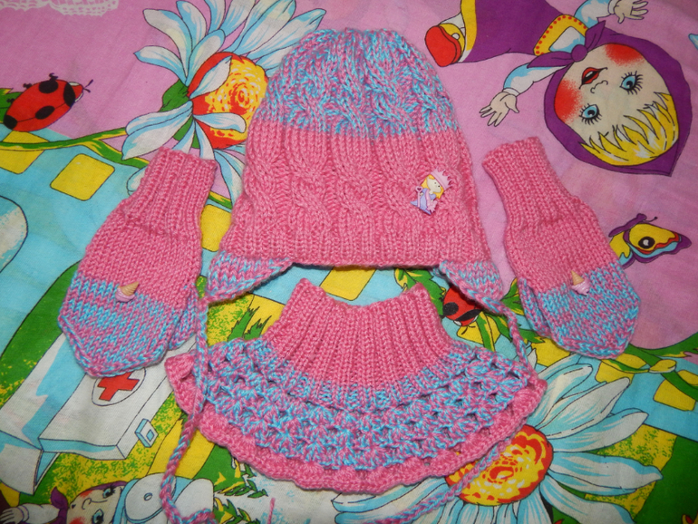 Вязался под новый костюм, цвета нашла такие только в акриле, пряжа - 100% акрил Олимпия Астарта, греческая. Все в 2 нити, плюс в шапке внутри подклад из этой же пряжи в одну нить (холодный демисезон-еврозима думаю отлично будет). К сожалению дочка бегала на примерке так, что не уловила я хорошего кадра, покажу один комплект.