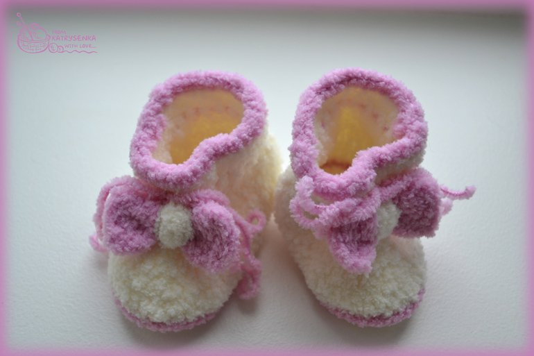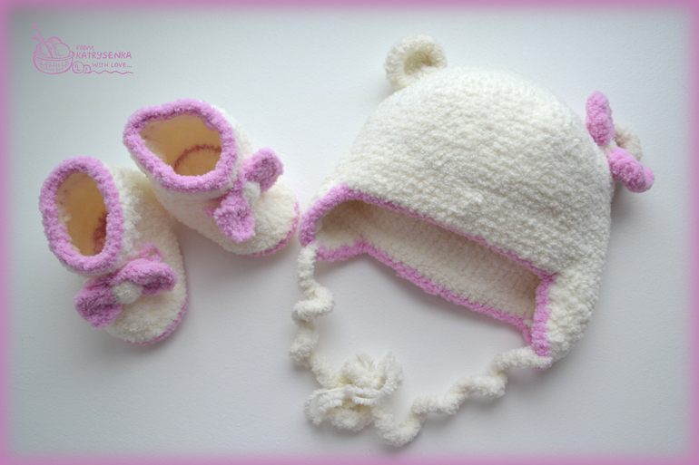 Шапуля связана в две ниточки крючком 1,9 на ОГ 38см, пинеточки в одну ниточку крючком 1,5 на ножку 8-9см, украшены пинеточки и шапочка бантиками.