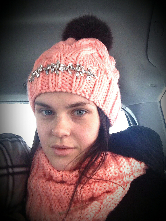 Этот комплект я вязала для младшей сестры. От нее была дана разнорядка - что-то нежное и ОБЯЗАТЕЛЬНО на шапке должен быть выложен узор из кристаллов.