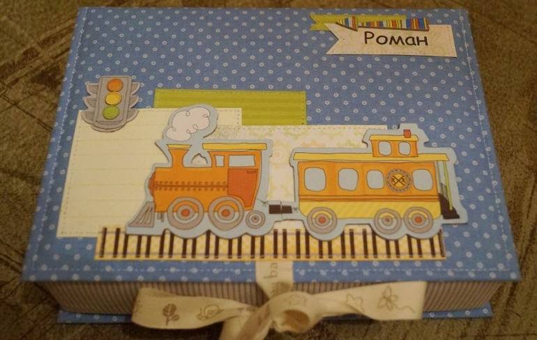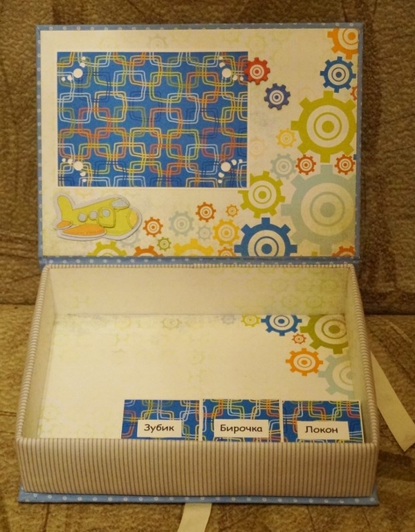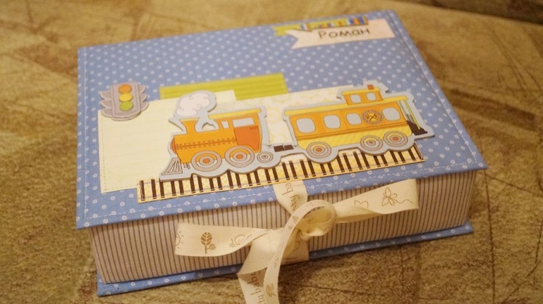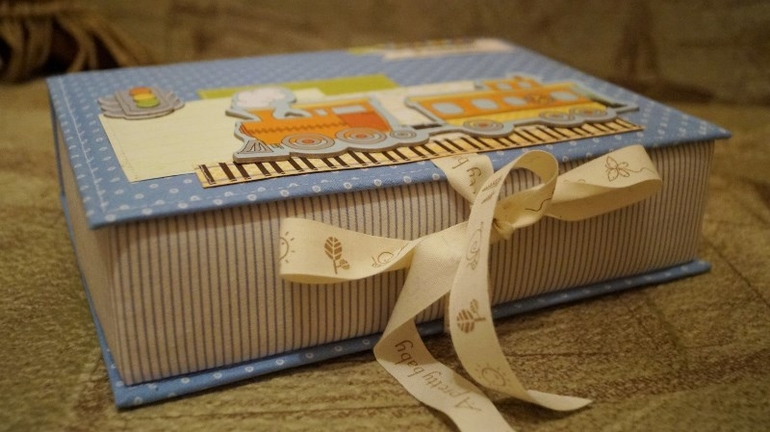 Скрапбукингдля моей коллеги сделалась вот такая коробочка, в ней она будет хранить не только бирочку, локон сына, но и крестильную одежку.