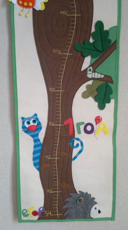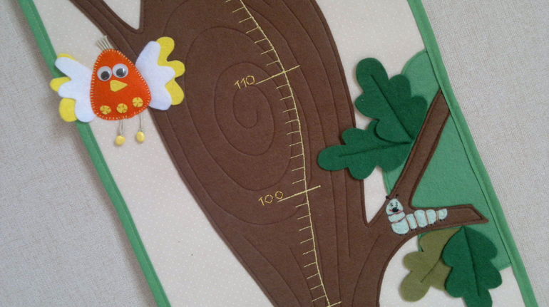 Можно добавить маленькие фетровые стикеры, на которые можно записать возраст ребёнка и приклеить стикер рядом с отметкой, до которой вырос ребенок.