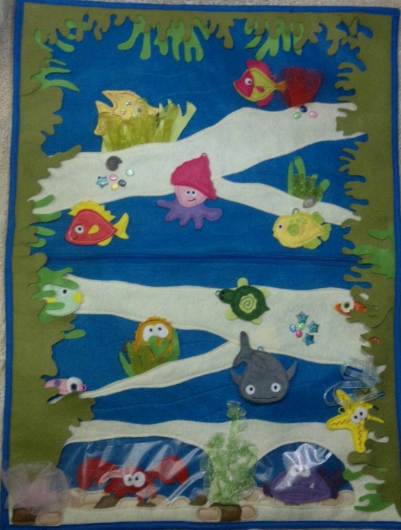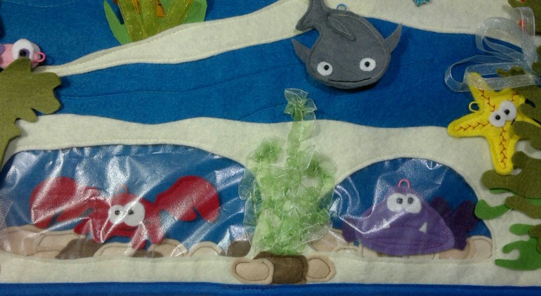 На морском дне среди водорослей в двух пещерках живут краб и очень серьезная рыба (обитателей можно менять). Рыбок можно прятать за разные водоросли. Можно спрятать всех морских жителей!