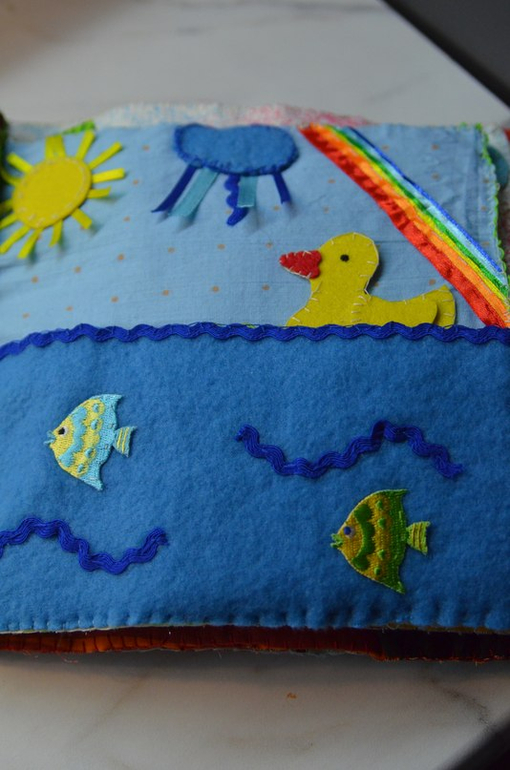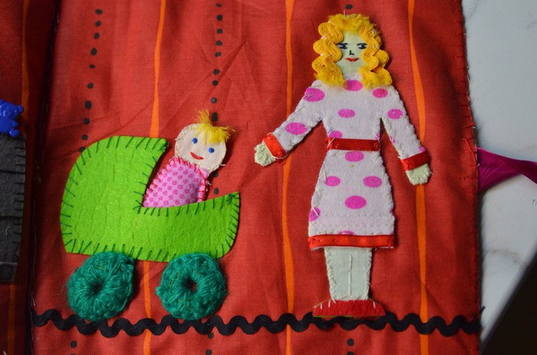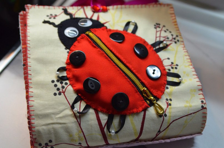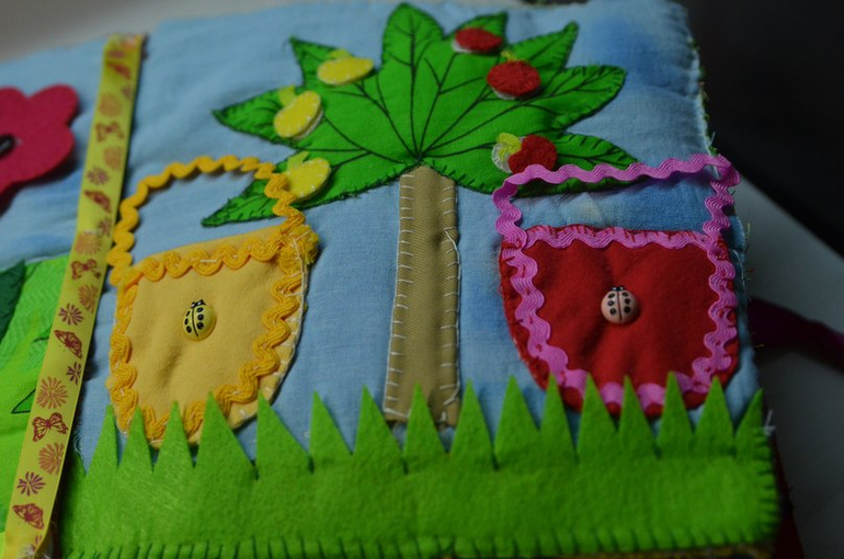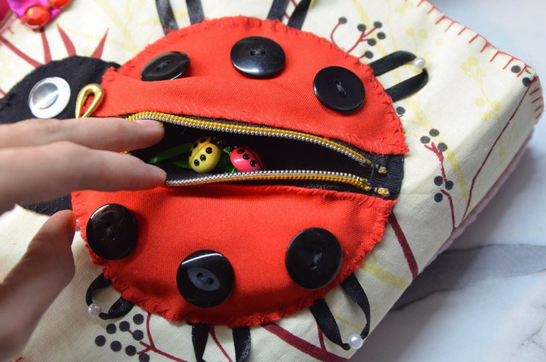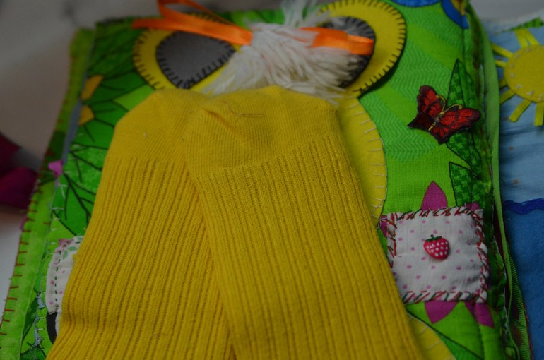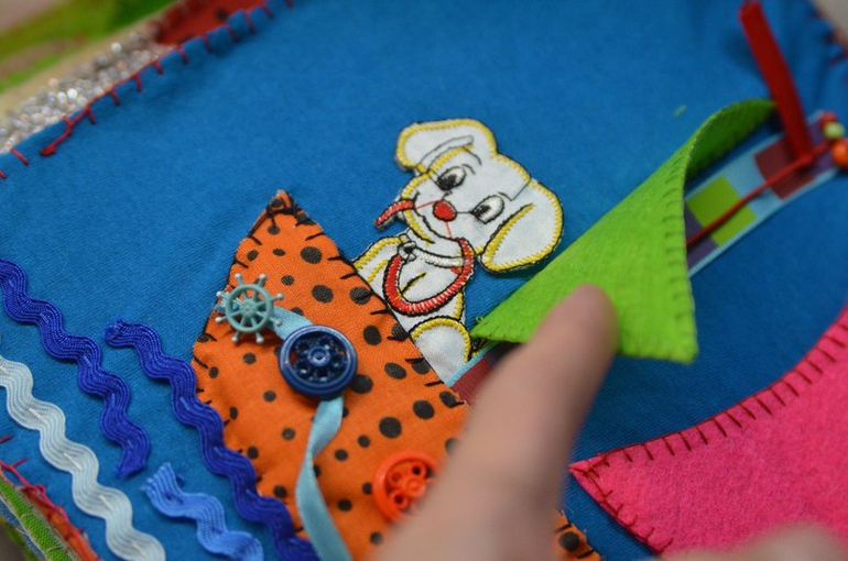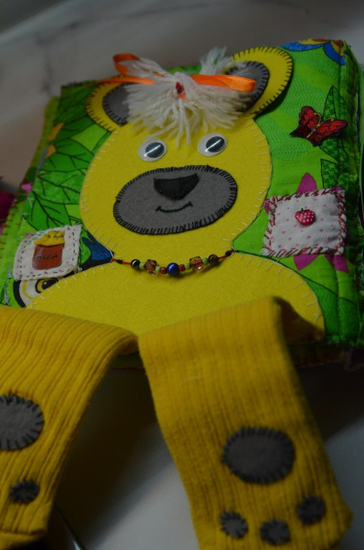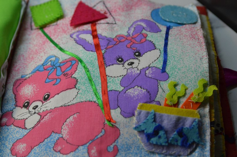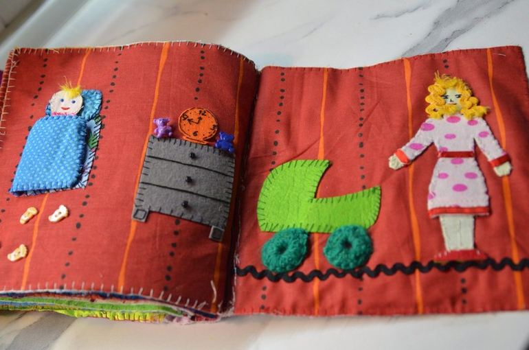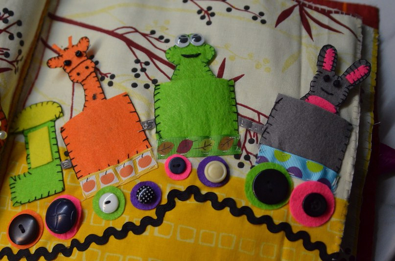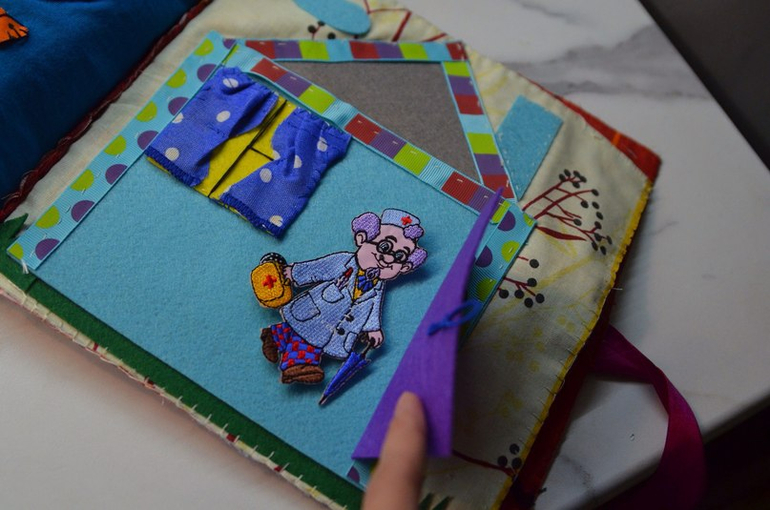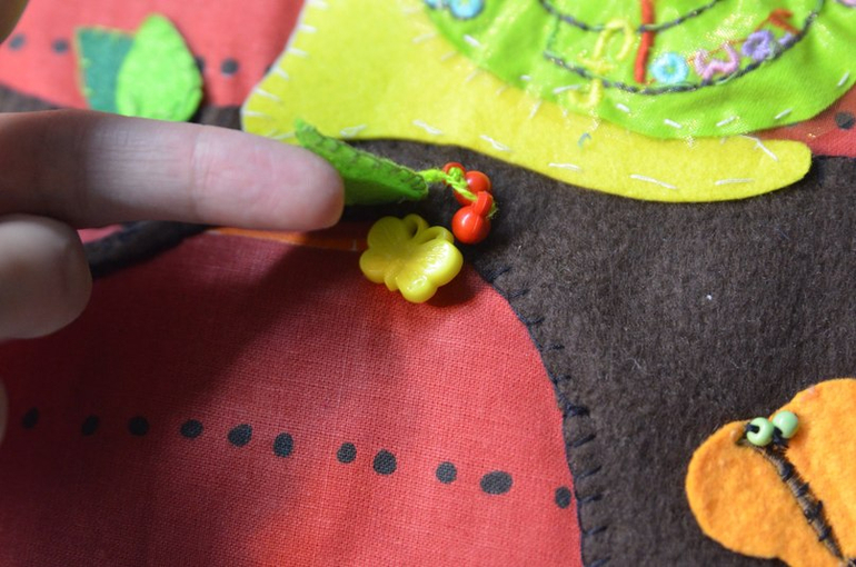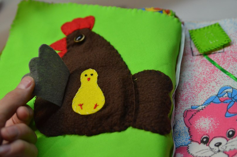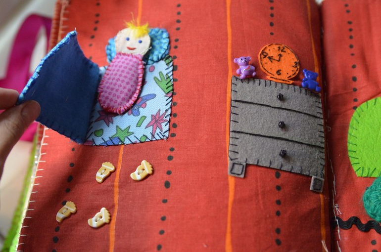 Нет, там все надежно пришито, да и играем мы обычно вместе с ней с книжкой) я ей на полтора годика подарила ее)
