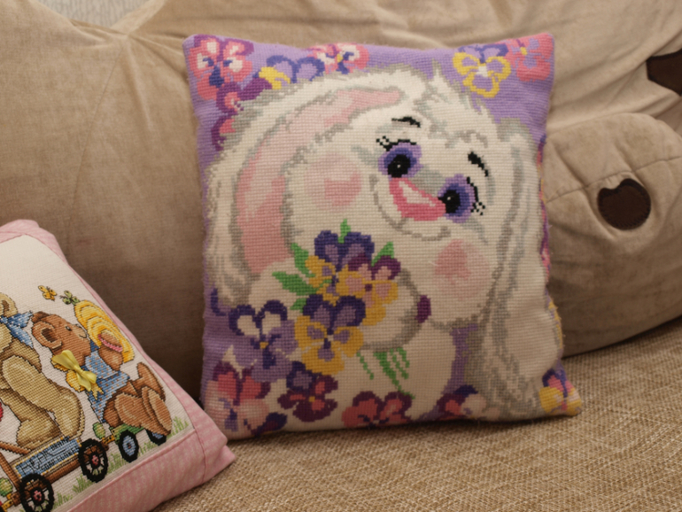 Вот мой очередной долгострой - вышивала пока была в декрете и даже чуть больше. Сшила наволочку только-только. Ещё подушку не набила холлофайбером. Очень хочу поделиться с вами, может кому пригодиться. Вышивку украсила бантиками из лент. Канву приклеила на дублерин, т.к после стирки канву перекосило слегка.