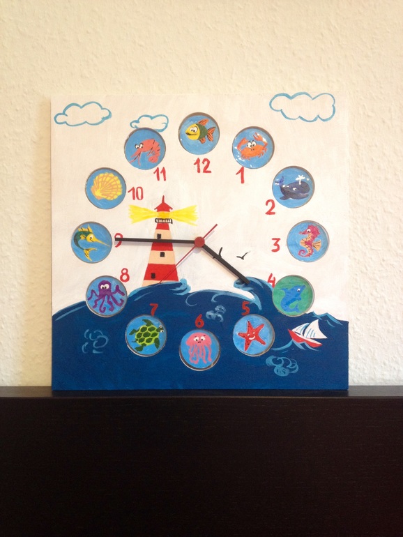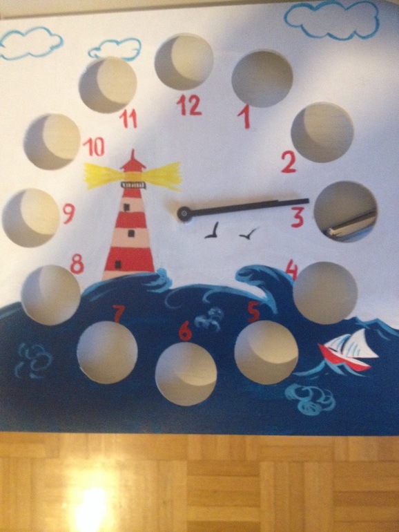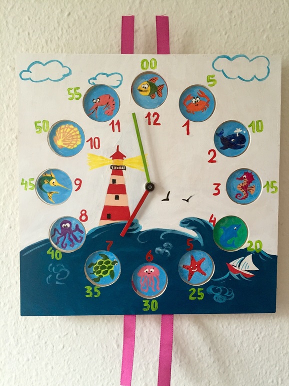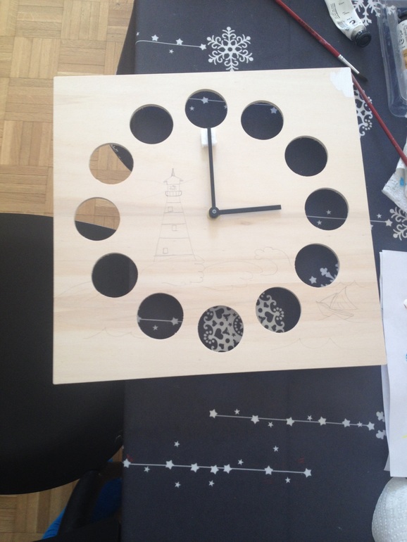 Деревянную заготовку часов купила в магазине. Механизм на ней уже был, оставалось только раскрасить. Может теперь дочь научится определять время.