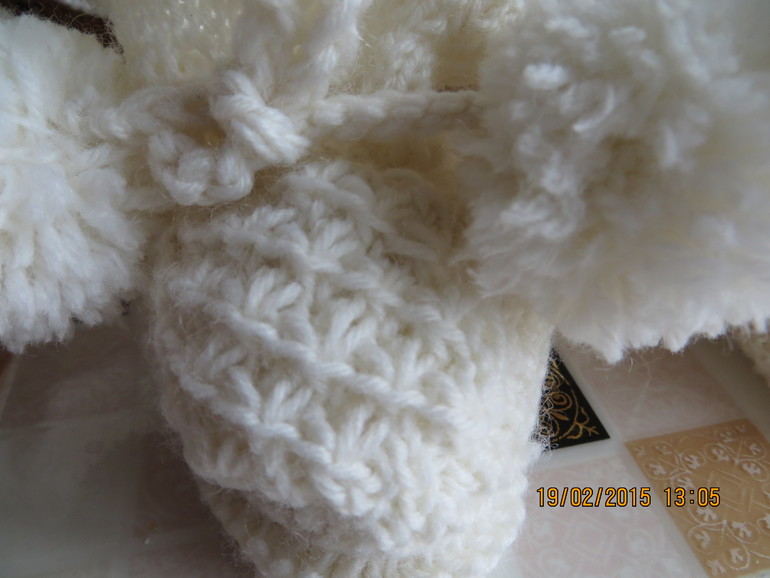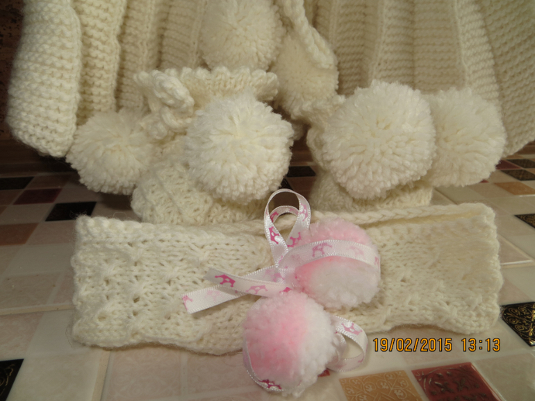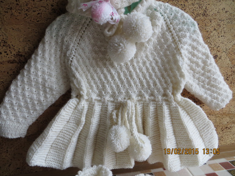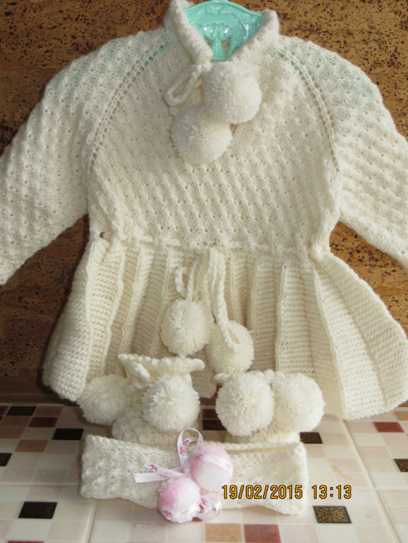 Комлект: платье, пинетки и повзяка связаны из гипоаллергенной пряжи спицами.Платье без швов.