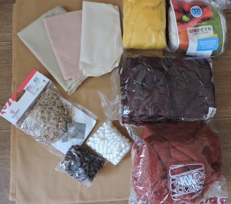 - ткань для тела: отрез цвета загара - 1м*1м, кусочки чайного, телесного, молочного цветов где-то по 20см*30см;