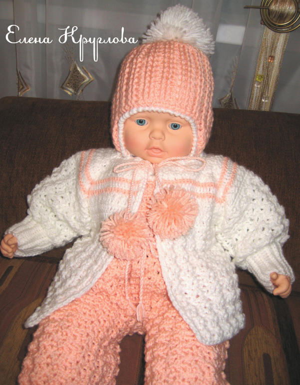 Связала давно,еще в 2013-м,но вот только дошли руки показать.Вязала для сестры мужа,она дарила своей подруге на рождение дочки.Комплект связан из полушерстяной пряжи,состоит из шапочки, комбеза,кофточки,носочков и царапок. Шапочка и царапки на флисовом подкладе.Хозяйке очень понравилось.