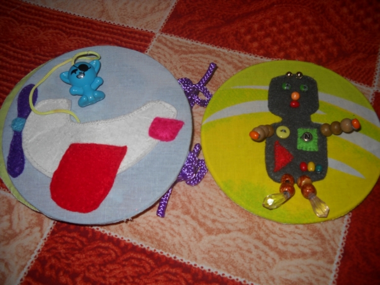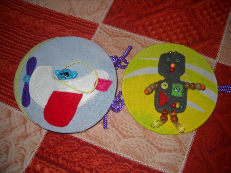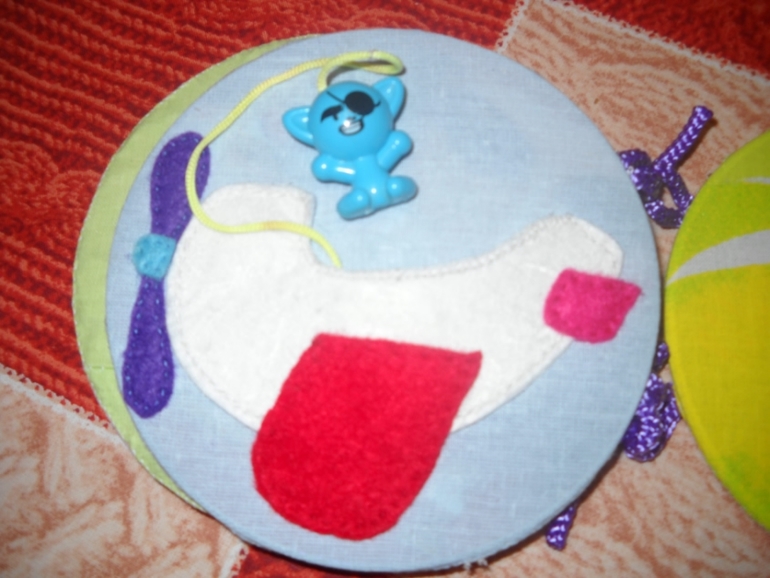 В основном все картинки - аппликации с пятью элементами, которые можно посчитать. Только самолетиком можно поиграть, в нем сидит пассажир, игрушка из киндера. Ну и ручки-ножки у робота можно потрепать