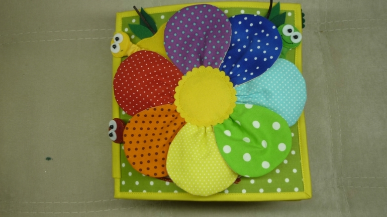Лепестки цветочка тактильные, часть шуршат, часть мягкие.