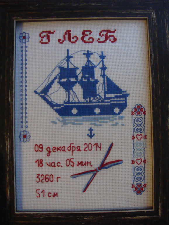 По фэн-шую изображение парусника очень хорошо иметь в комнате, это символ изобилия и благополучия, но разместить его надо так, чтобы парусник "вплывал" в комнату, т.е. носом он не должен смотреть на дверь. Не, я не увлекаюсь, но рада, что пожелание мамы крестника иметь метрику "на все времена" (не мишки-пинетки-коляска, а что-то нейтральное) пересеклось с таким симоволом и его хорошим значением.