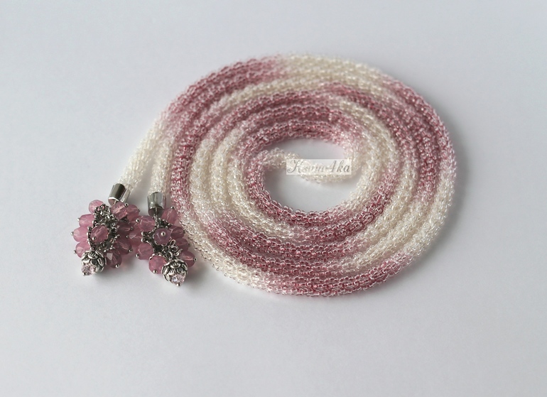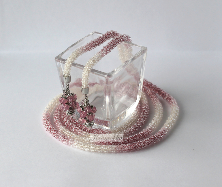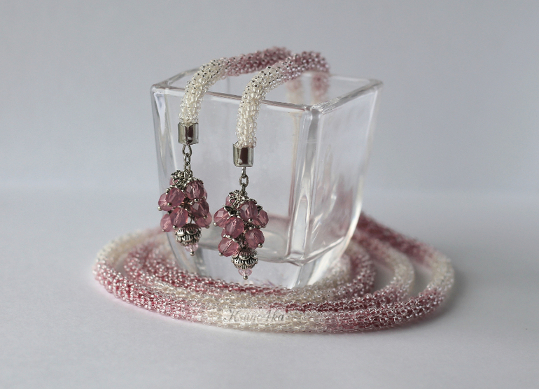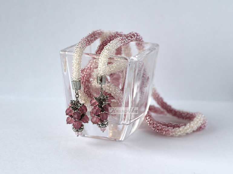 Выполнен из чешского прозрачного бисера, хлопковой меланжевой пряжи приятной спокойно-розово-белой расцветки. Для подвесок использованы чешские бусины и фурнитура под серебро.