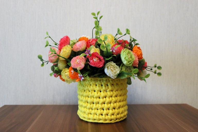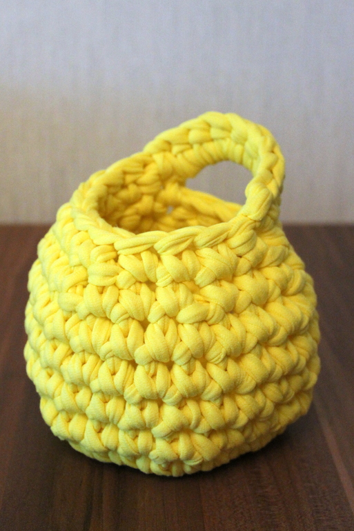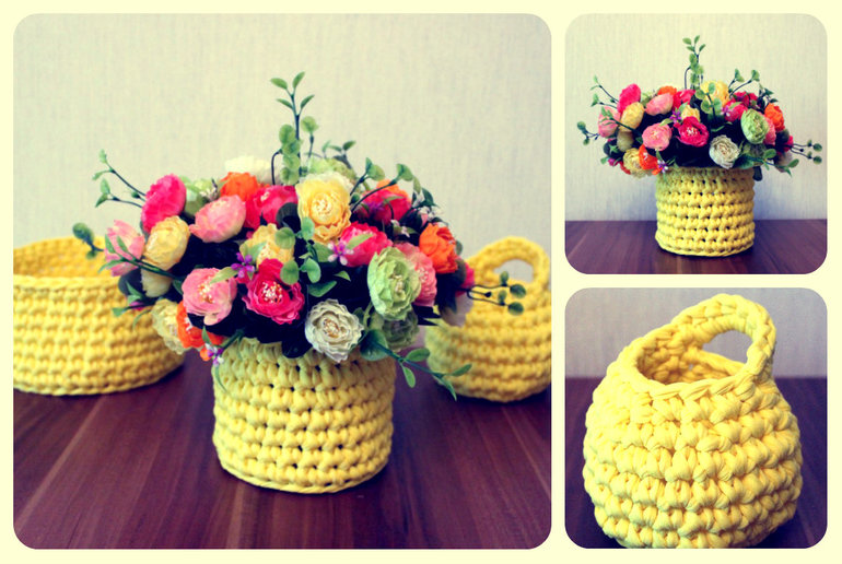 На три таких корзинки у меня ушло 1,5 мотка желтой пряжи.