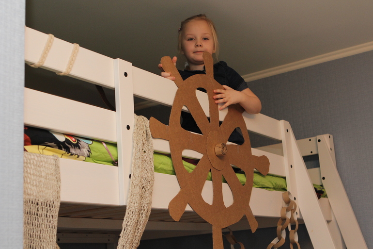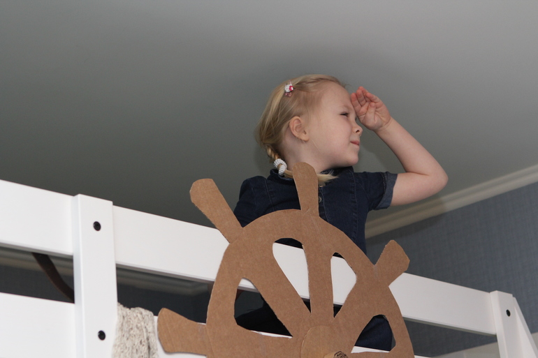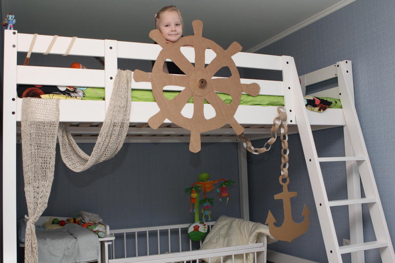 Поделки с детками.В однушке может и не очень просторно, зато очень уютно и весело. Вчера вечером читали «Остров сокровищ». В итоге, пока я читала, Соня была доктором Ливси, и яростно отбивала атаки пиратов (мы как раз читали, как пираты нападали на форт), так что мое чтение прерывалось воплями «Трелони, ядро, ложись». В общем, повеселились так, что на следующий день решили продолжить и подойти к вопросу серьезно. Пришлось строить корабль. Показываю результат. Все таки икейская кровать-чердак просто необъятная площадка для творчества…