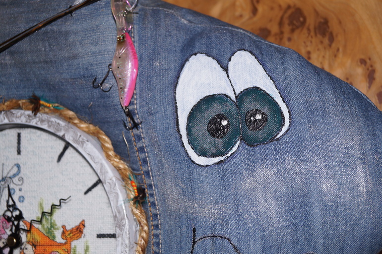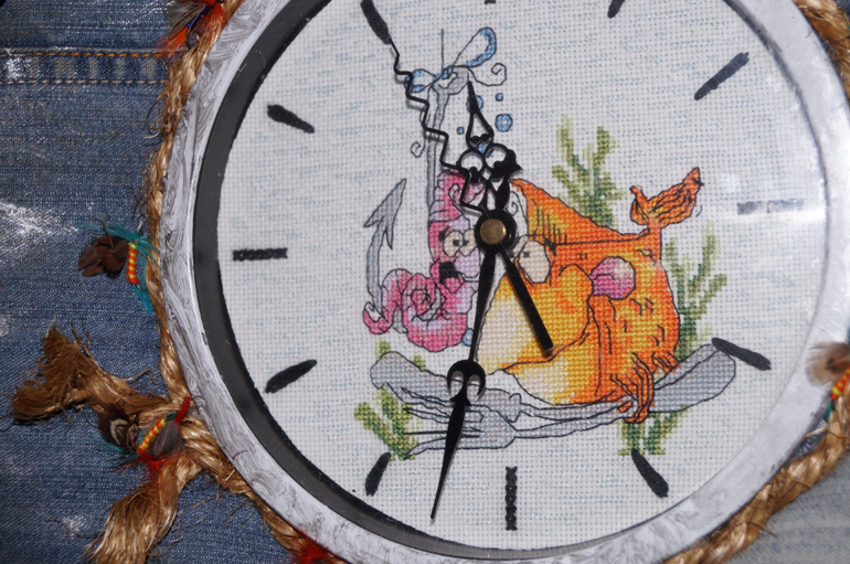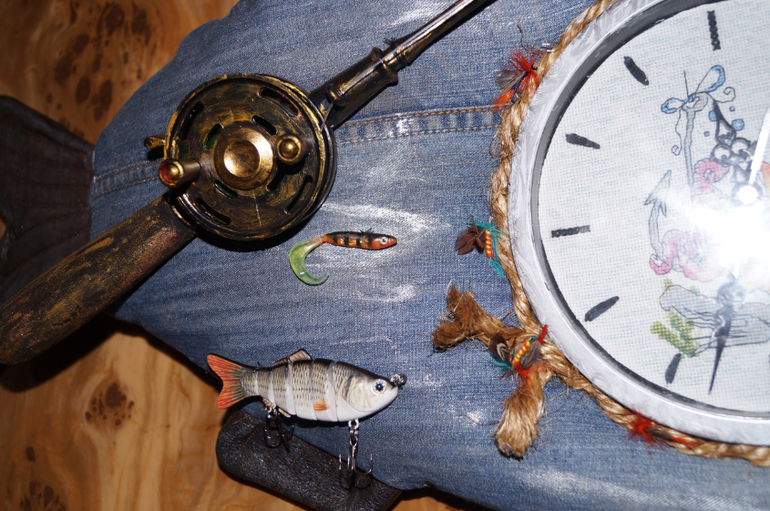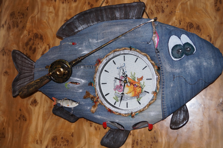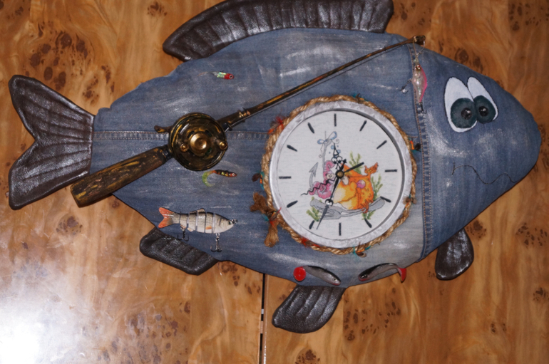 Декор, витражи.для мужа сестры, заядлый рыбак) циферблат - вышивка, основа рыбы фанера, синтепон, джинса и разные наживки из рыбного магазина