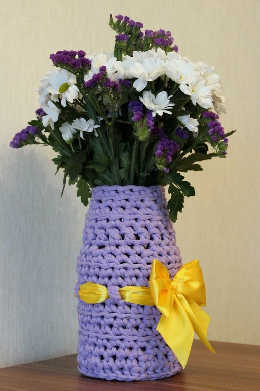 Именно так я рассуждала на этих выходных... Душа просила весны, муж весну принес домой, а поставить было не куда. Поэтому я взяла обычную банку и обвязала ее хлопковой пряжей "Лента", моим любимым цветом - лаванда.
