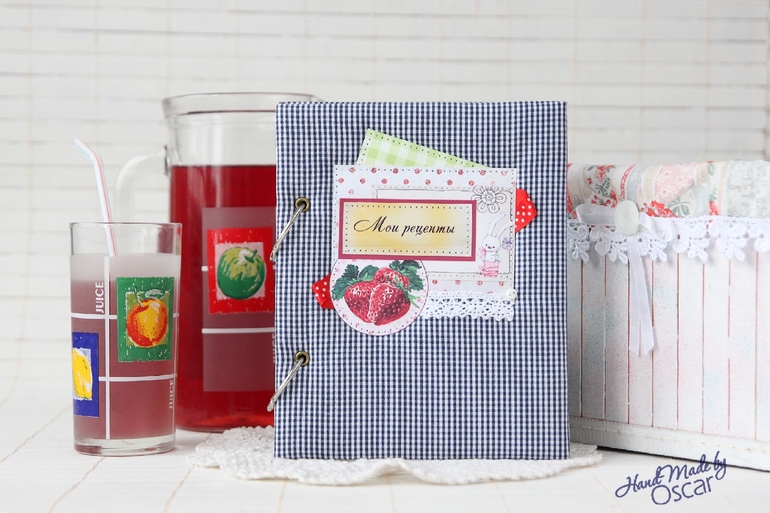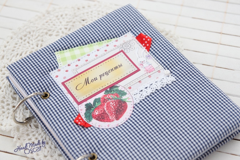 Обложка из хлопка классической кухонной расцветки - в мелкую клеточку. Первое что пришло в голову - добавить вкусные красные акценты. Так и сложился образ этой кулинарочки.