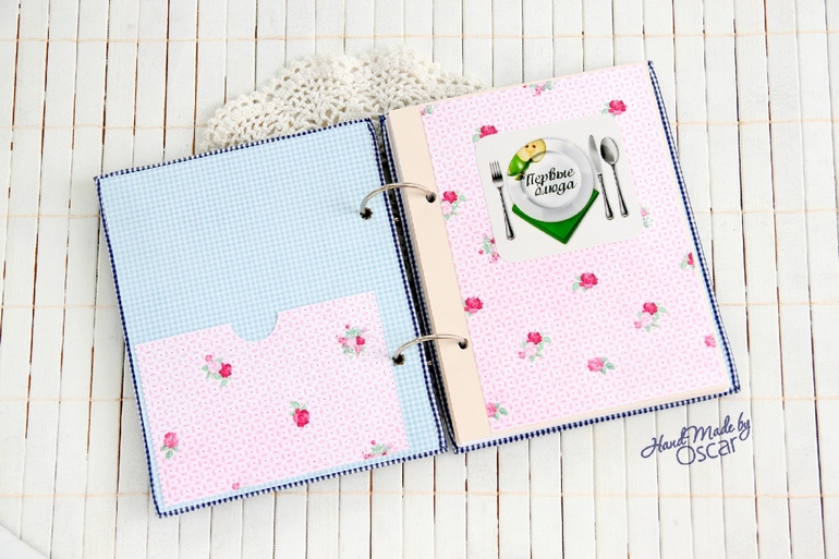 Переплет на кольцах, внутри удобные разделители, делала их в фотошопе специально для этой книги. На первом и последнем форзаце кармашки для вырезок