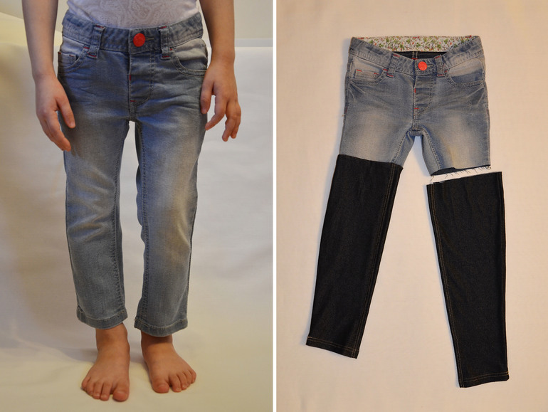Очень интересная идея! Дочка модель! А еще можно наверное не полностью штанину менять, а частично, как вставки делать