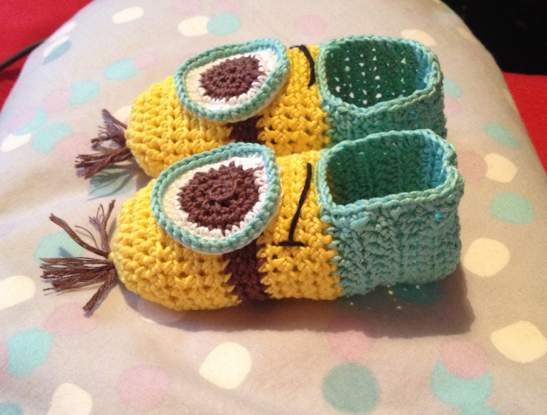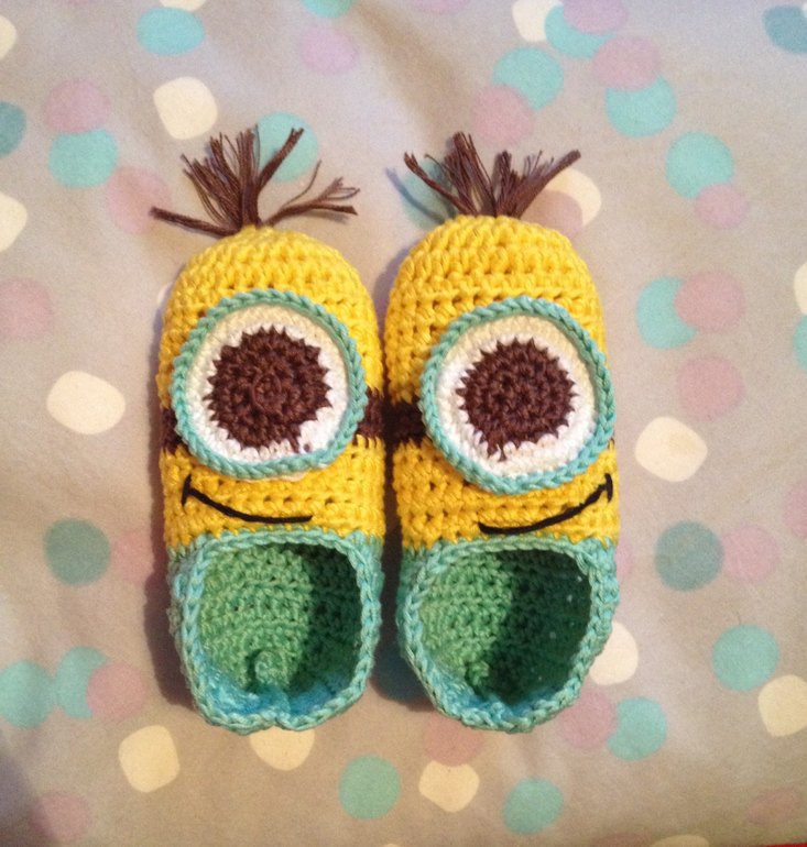 Потянуло на мультяшные персонажи ))) связала малышу такие вот тапочки-игрушки веселые по мотивам прикольных Миньонов. Конечно цветовая гамма не точная, не было черной и синей пряжи под рукой, но вроде общая картина сложилась )) пряжа из хлопка, крючки №2,5 и 3,5
