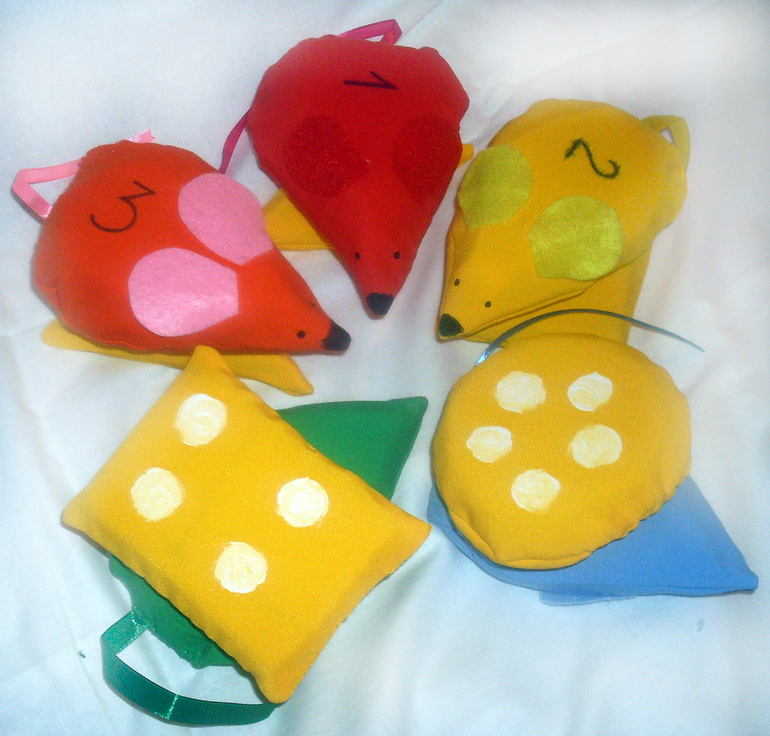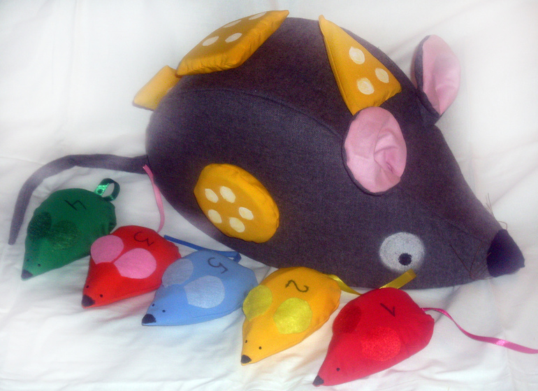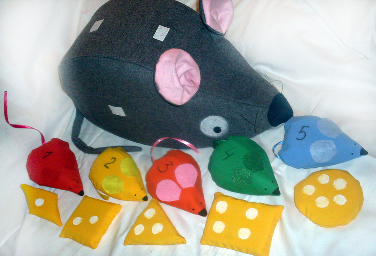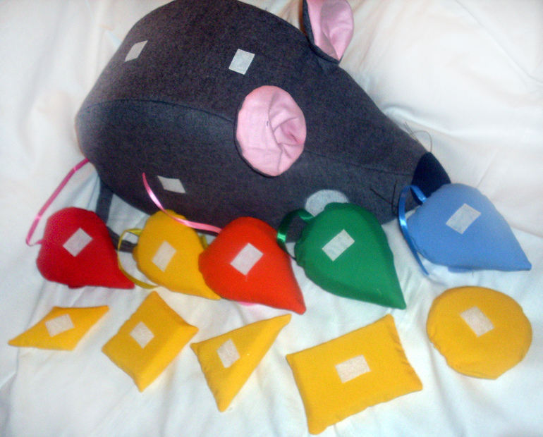 Учим цвет, форму, размер, количество, счёт до 5.Для 3-4 лет.Идея и воплощение моё.Задание из педучилища:) придумать и сделать дидактическую игру( дочка старшая подкинула).Дело за малым - описать всё вразумительно:)Размер внушительный, мышь серая 50см на 30см примерно.