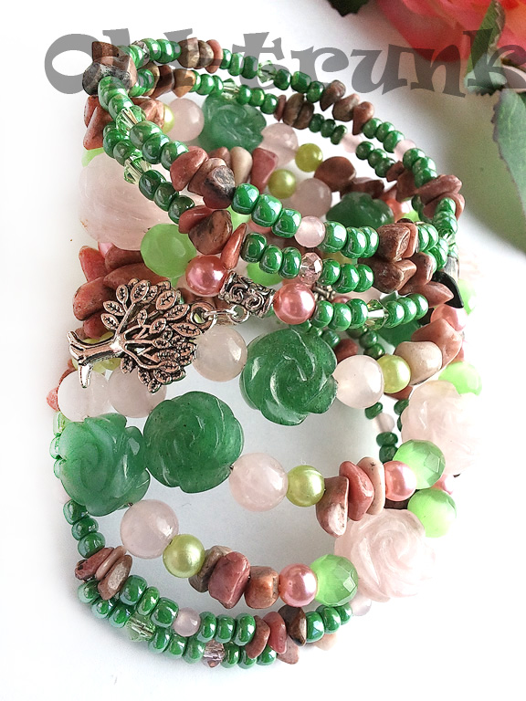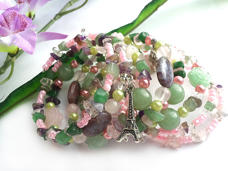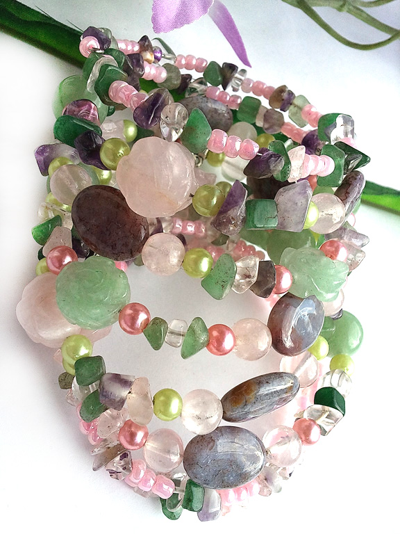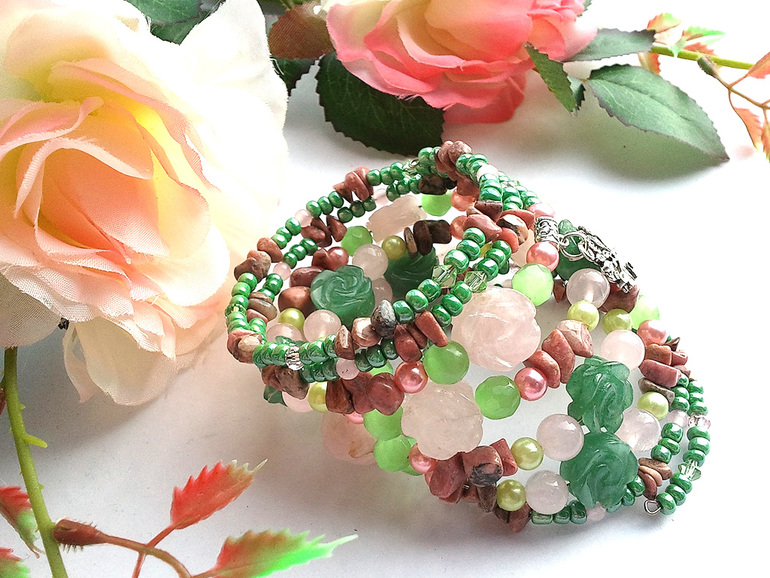 Розовый кварц, аметист, яшма зелёная, жадеит, горный хрусталь, родонит, стекло, металл, акрил, бисер.