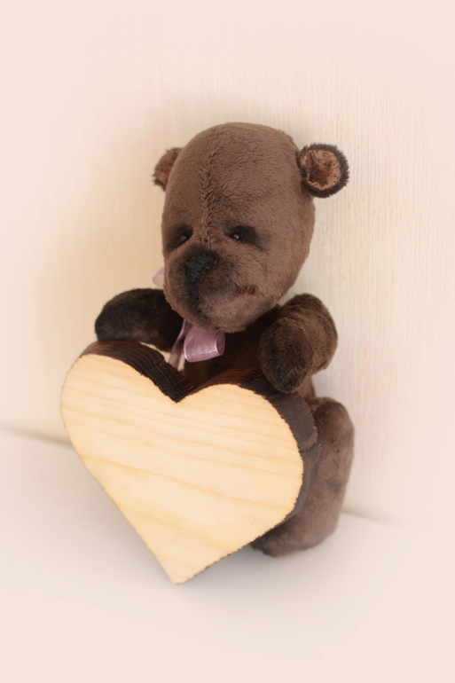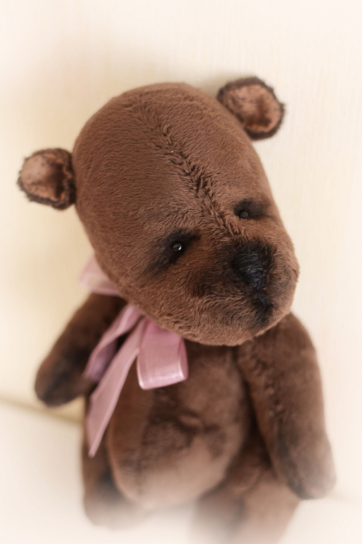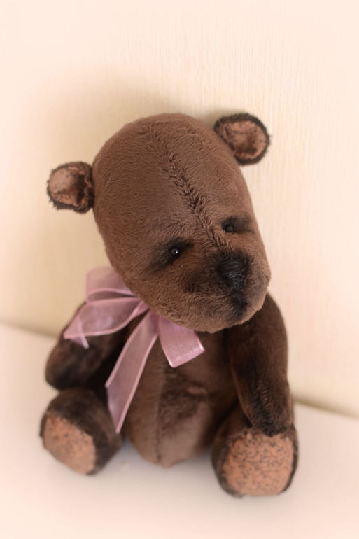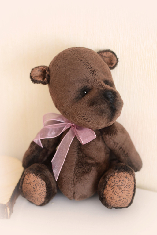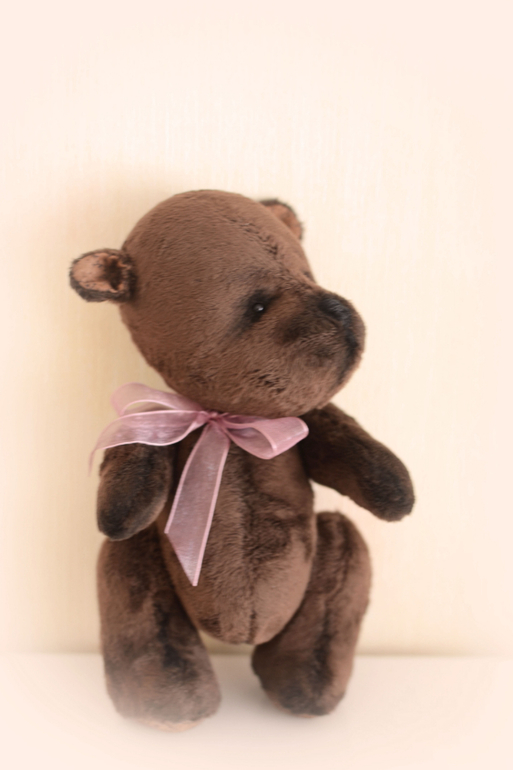 Малыш сшит из нежного плюша, глазки стеклянные, носик вышит, ростом медвежонок 22 см., умеет хорошо сидеть и стоять с опорой, лапки и голова на шплинтах и двигаются.