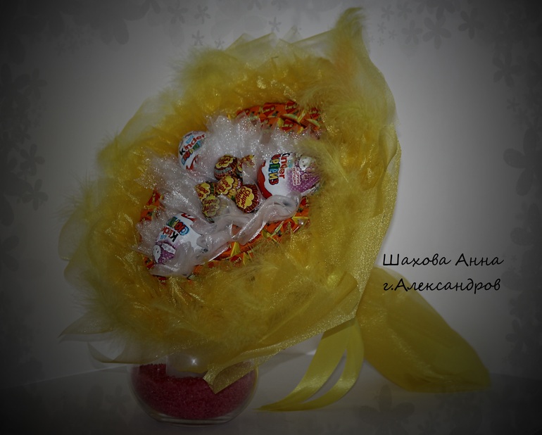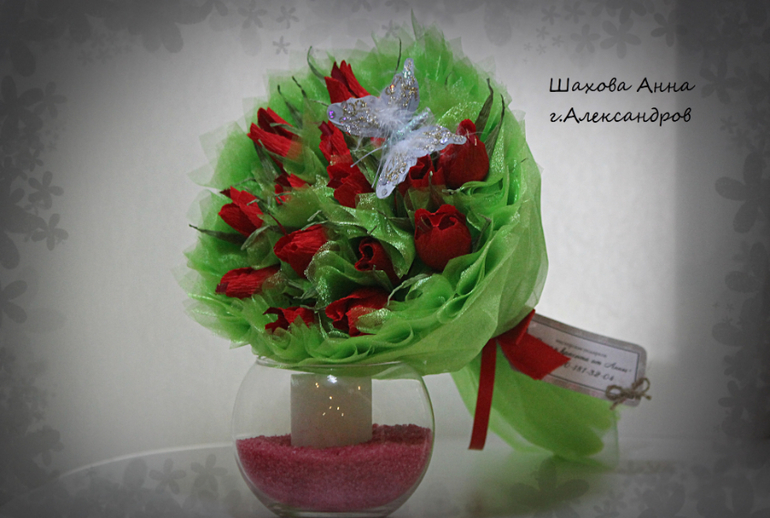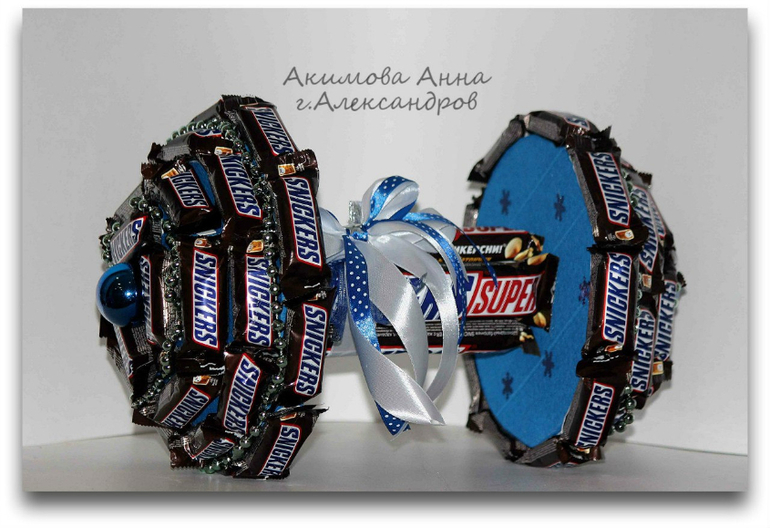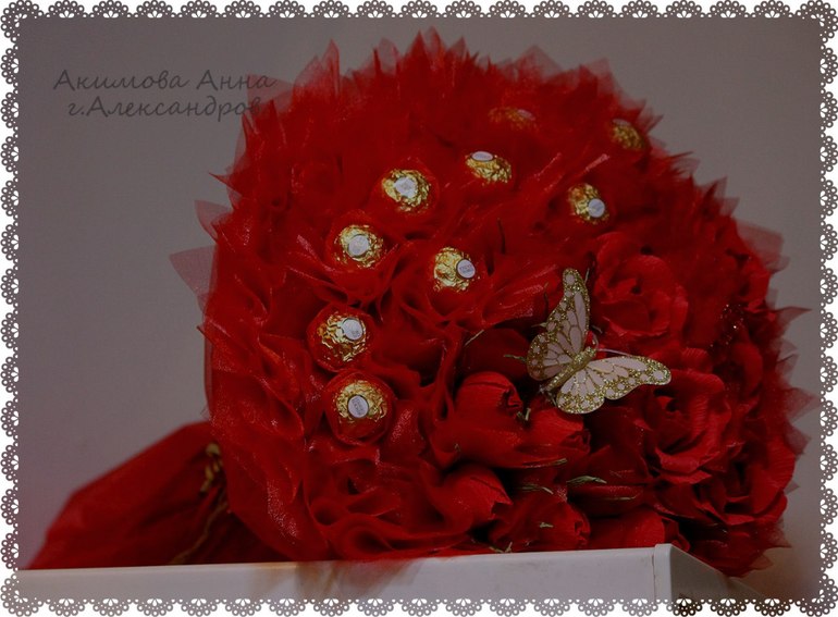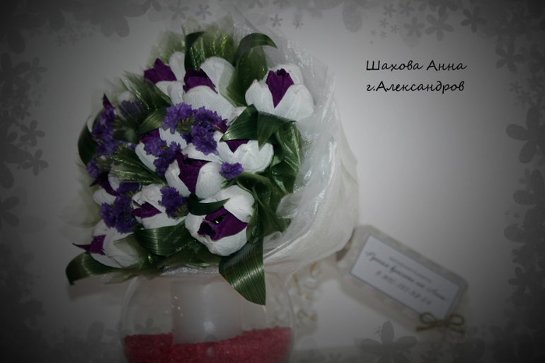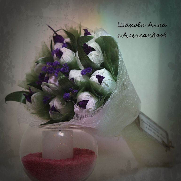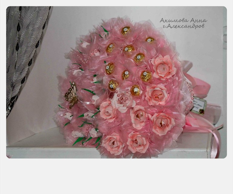 Аня, я в шоке - столько красоты! Органзовые букеты - верх элегантности. Гантелька - улыбнула! С праздником!