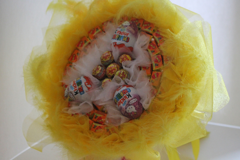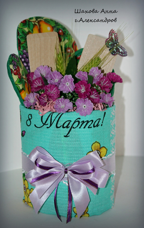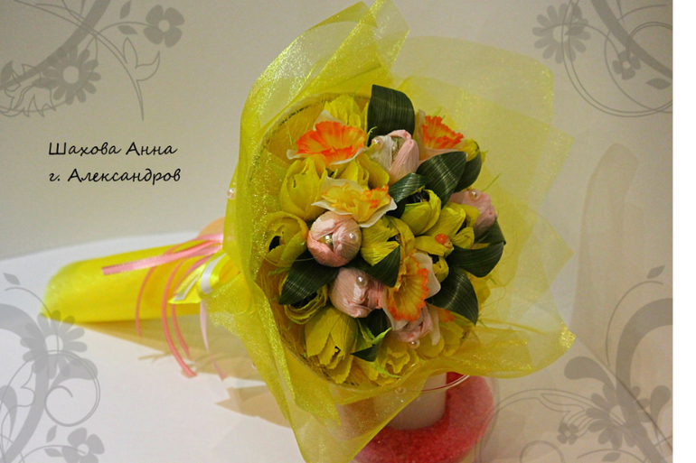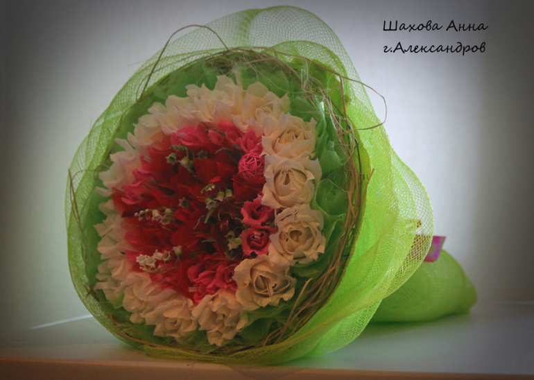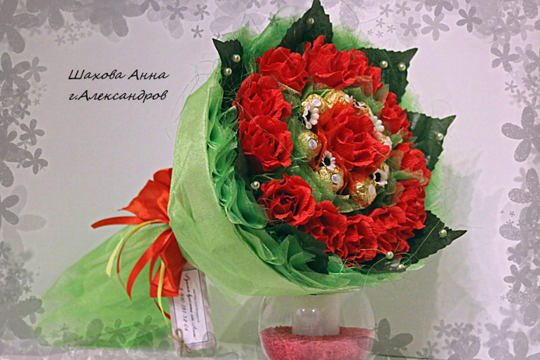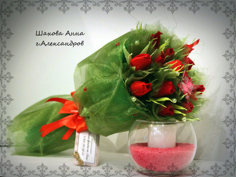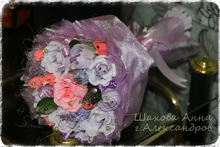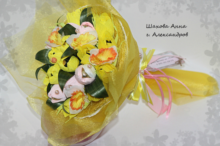 Аня, я в шоке - столько красоты! Органзовые букеты - верх элегантности. Гантелька - улыбнула! С праздником!