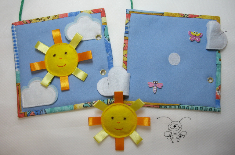 Солнечный денек: солнышко крепится на липучку и может выступать самостоятельной игрушкой. За облачками прячутся стрекоза и бабочка.