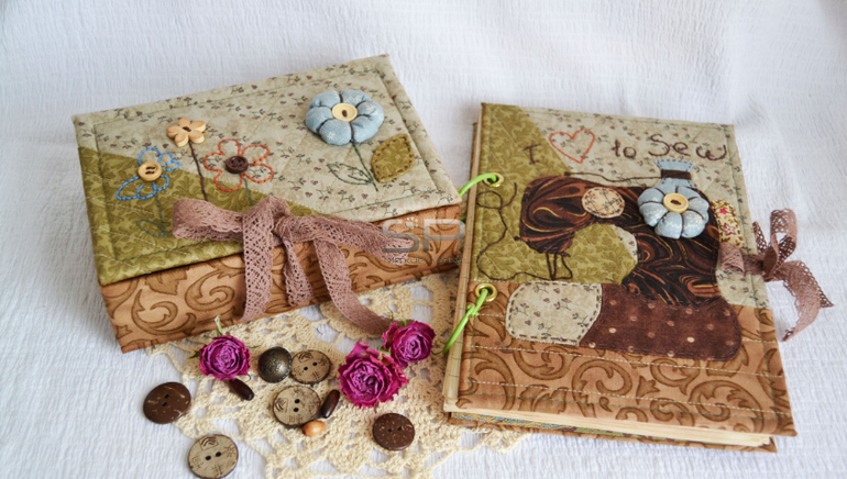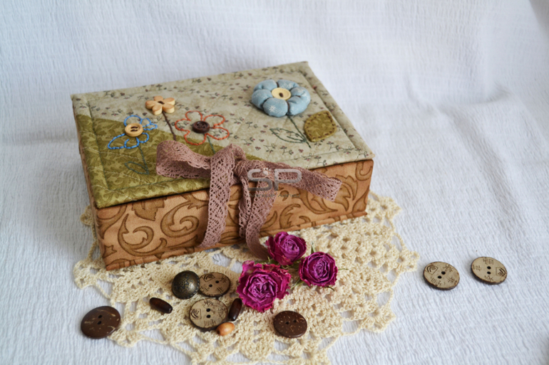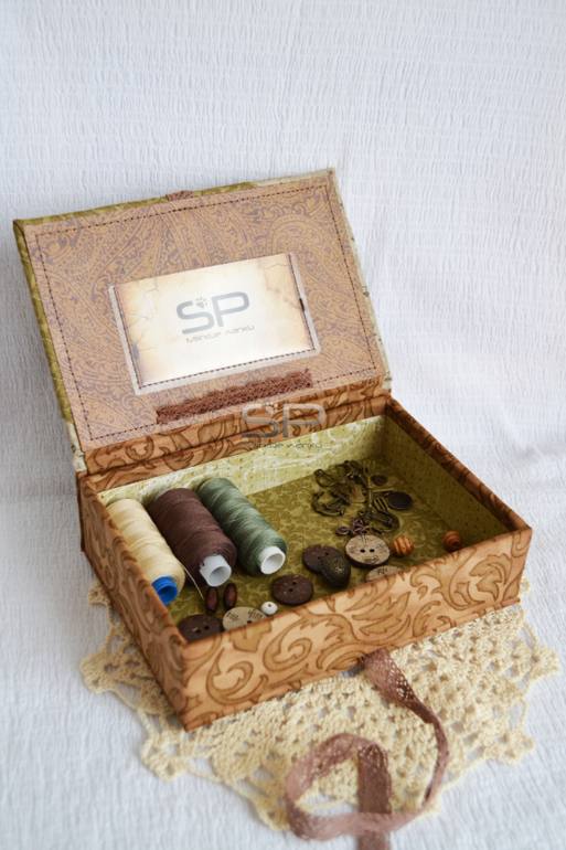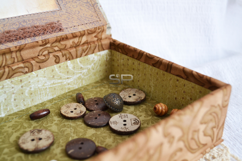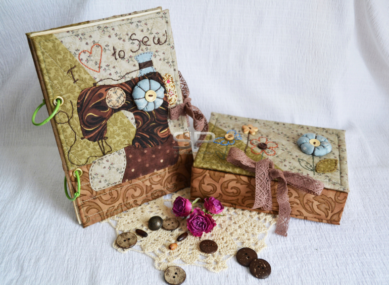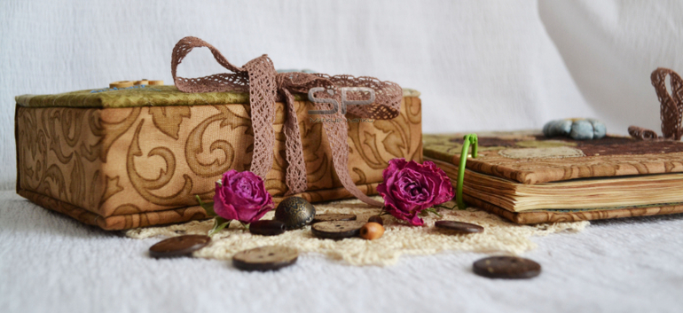 Комплектик состоит из блокнота и шкатулки-коробочки для мелочей. В блокноте около 80 листов, разлинованы, края тонированы кофе и состарены. Обложка декорирована объемными элементами, стежкой. В пару к блокноту мягкая шкатулочка, декорирована пуговками, объемными элементами, стежкой. Очень мягкая)))