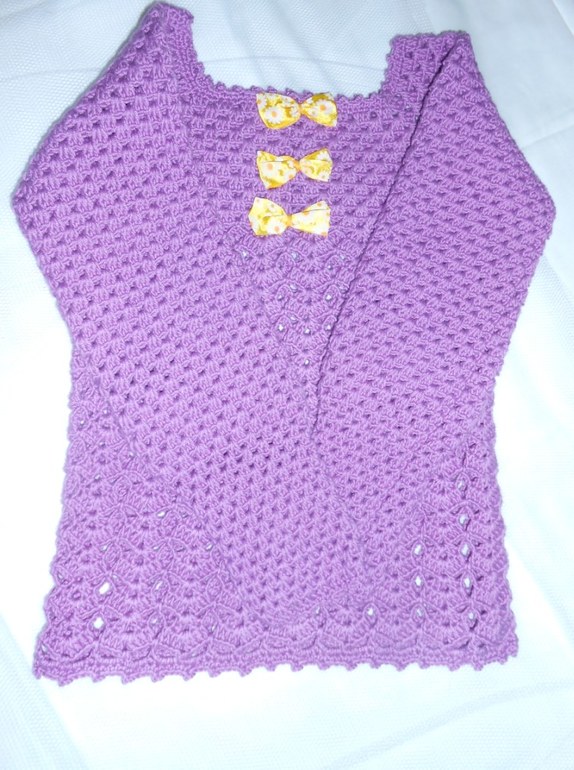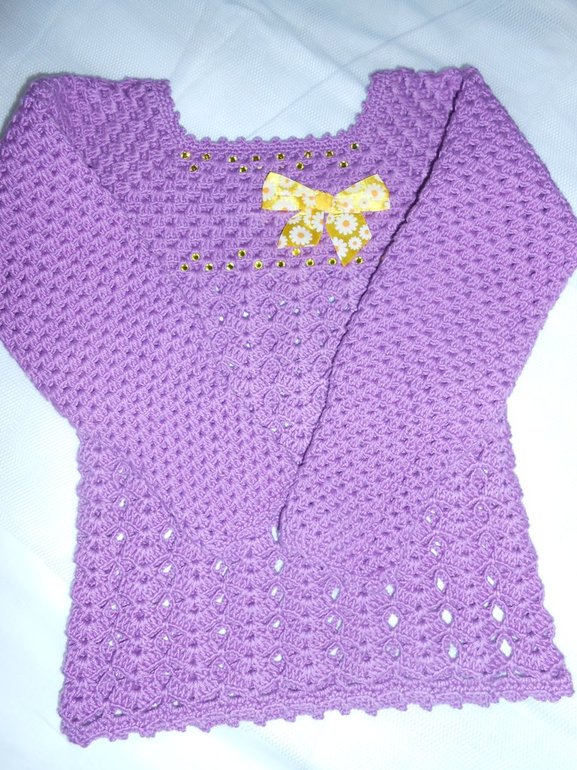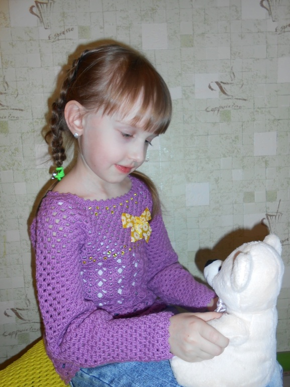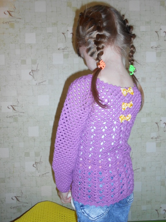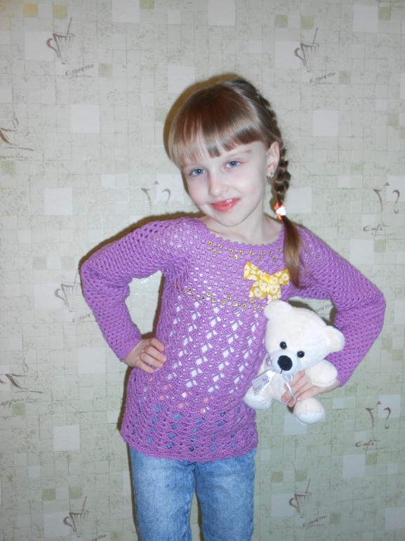 Связался для дочки вот такой джемперок: ниточки Gazall baby cotton, крючок №2, атласная лента, термостразы. Приглашаю всех к просмотру