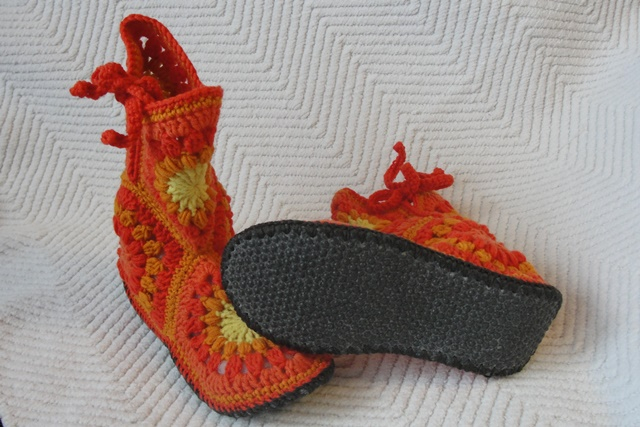 тапочки связаны крючком из полушерстяных ниток, подошва из войлочной стельки на резиновой основе.