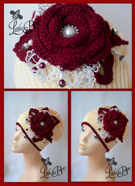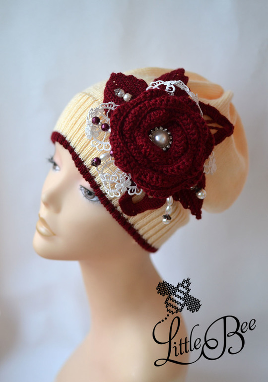 Ох и долго я мучила этот заказ, нужно было связать шапочку под бордовое, стеганное пальто с вязанным цветком. Изначально заказчица хотела ярко розовую шапку, но у меня все никак не вязался розовый цвет с бордовым, хоть убей, может у меня не тот оттенок был. Я на свой страх и риск связала вместо розовой нежно желтую, пастельную шапочку и сделала яркий декор в цвет пальтишка. ООООчень надеюсь, что ей понравится)
