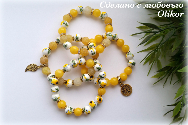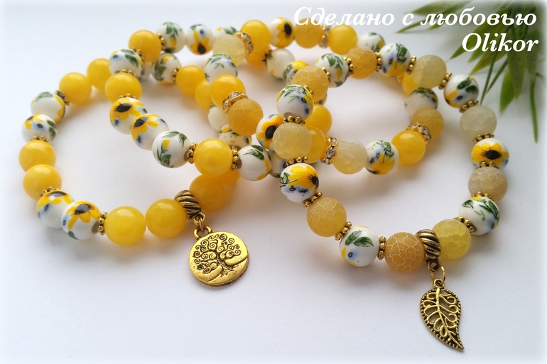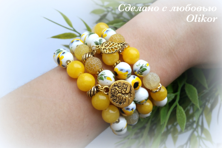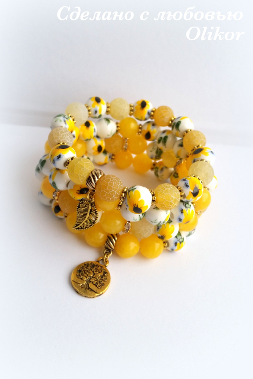 Бижутерия для слингомам. Слингобусы. Грызунки.Еще одна новинки из цветочной серии - очаровательные и жизнерадостные подсолнухи. Браслеты собраны на резинку из тонированного агата, матового агата-кракле и керамических бусин.
