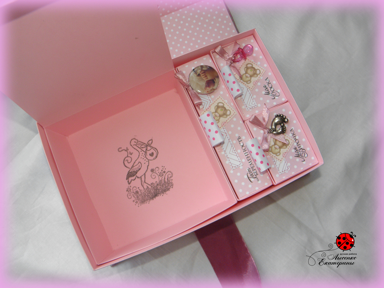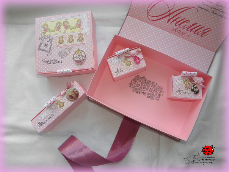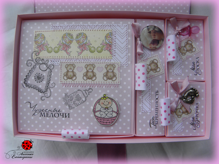 Имеет в себе коробочки для сосочки,бирочки,тестика,а также коробочку для разных важных и дорогих сердцу мелочей)