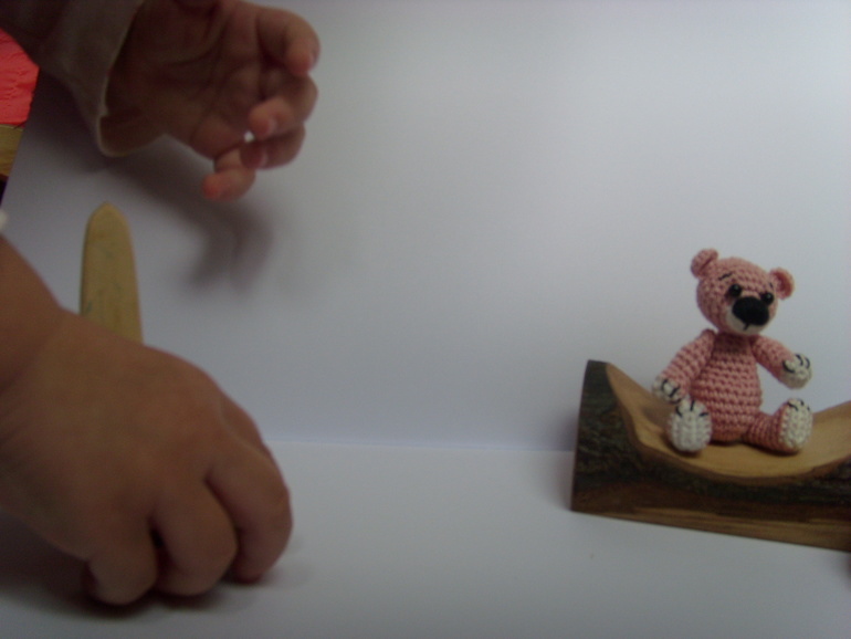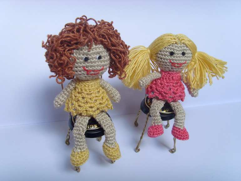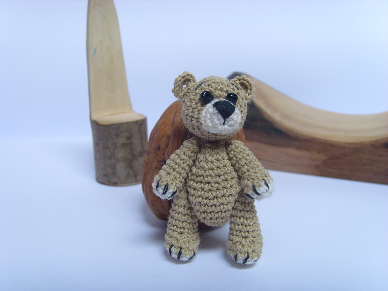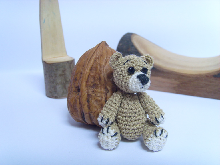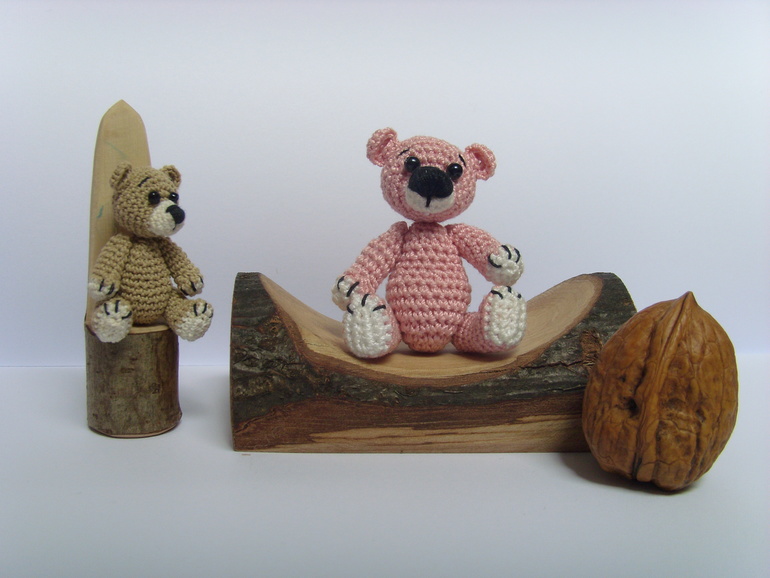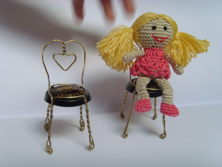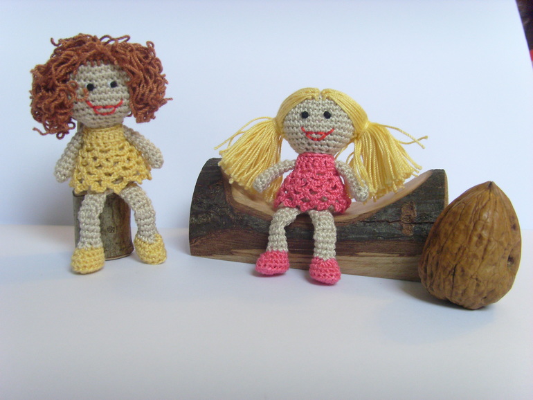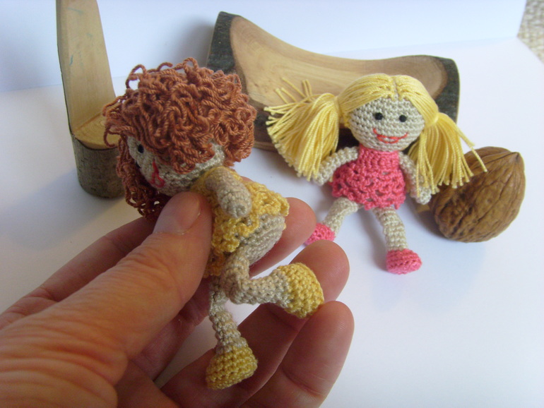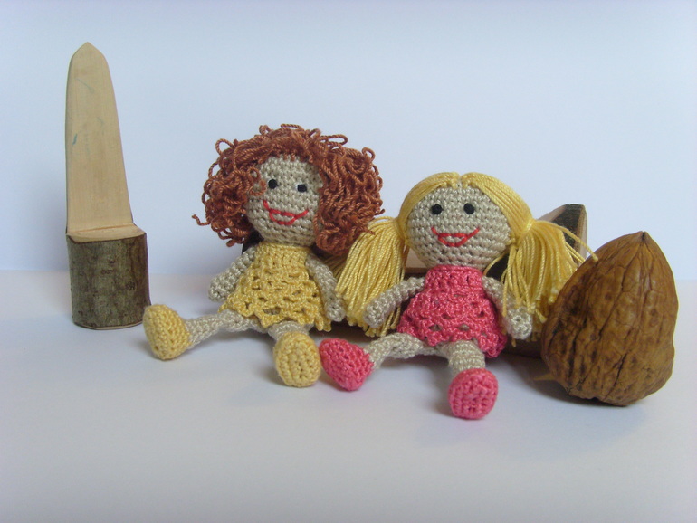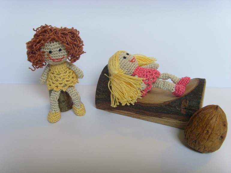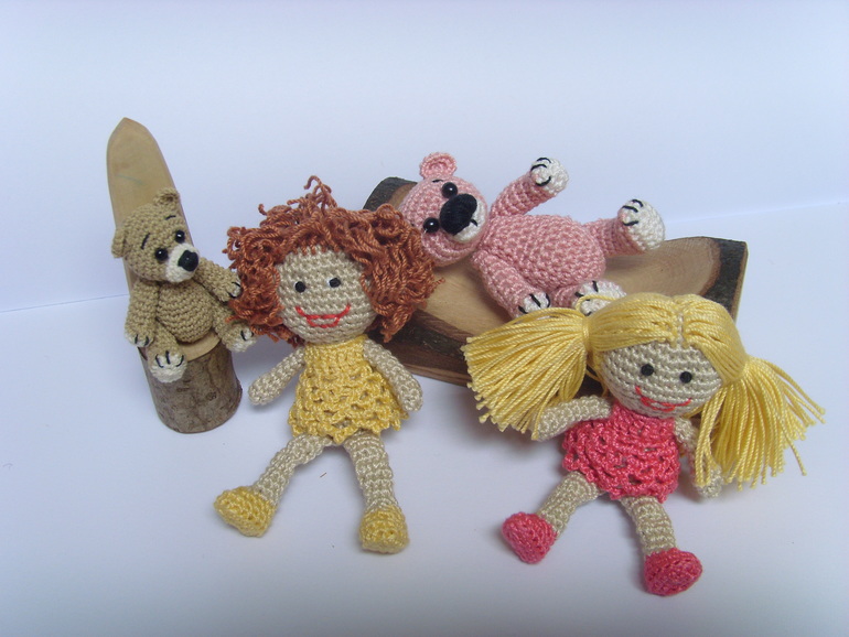 Садик, в который ходит старшая дочь был закрыт на 7 месяцев на ремонт и достройку нового здания(и сейчас тоже продолжаются кое какие отделочные работы). И после открытия кто то сделал в группу небольшой двух этажный кукольный домик с маленькой мебелью. Вот только куколок подходящего размера для этой мебели не было.Ниже на фото будет одна кроватка и стул от этой мебели как пример. Воспитатель зная, что я иногда могу чудить по рукоделию попросила, не могла бы я что нибудь организовать. Я и начудила, куколки размером 7,5 см. Сначала хотела сделать проволочный каркас и крутящеюся голову, но потом подумала, что куколки всё таки игровые и лучше покрепче. И вот что получилось.Куколки могут сгибать коленки. Правда лица мне их не очень нравятся, но не знаю что придумать( критикуйте и предлагайте варианты). А медвежата вязались ещё года 4-е назад, но покажу заодно в компании. Грецкий орех для сравнения размера. Мишки на нитяном креплении. Могут сидеть, могут стоять, могут поднимать лапки и поворачивать голову.При фотографировании у меня было две помощницы. Так что то там, то здесь будут появляются мои сладкие ручонки и пропадать игрушки.