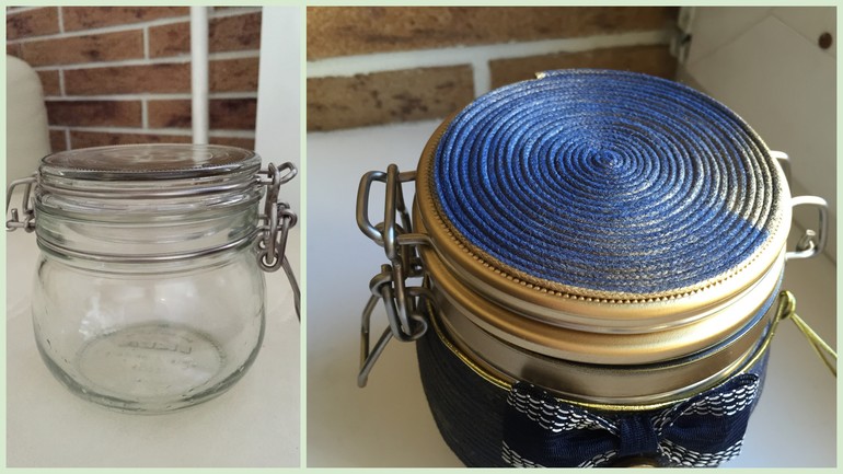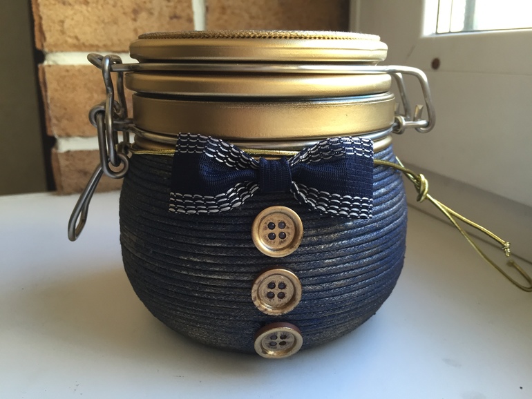 Знакомая девочка попросила задекорировать банку, нужна была срочно в подарок молодому человеку сластене (внутрь она положила варенье))). В работе использовала вощеный шнур синего цвета, универсальный клей ПВА, краска в баллончике (спрей)) и лак в спрее. Вот через 2 часа банка готова) Быстро, просто и красиво (на мой взгляд)) В итоге у меня получился "стильный джентльмен"