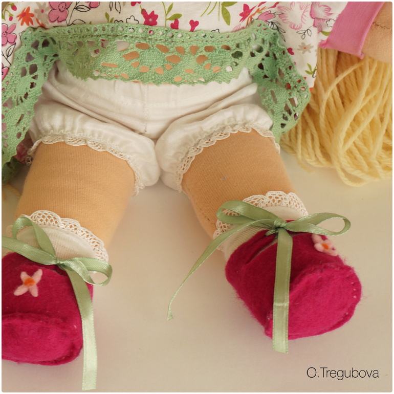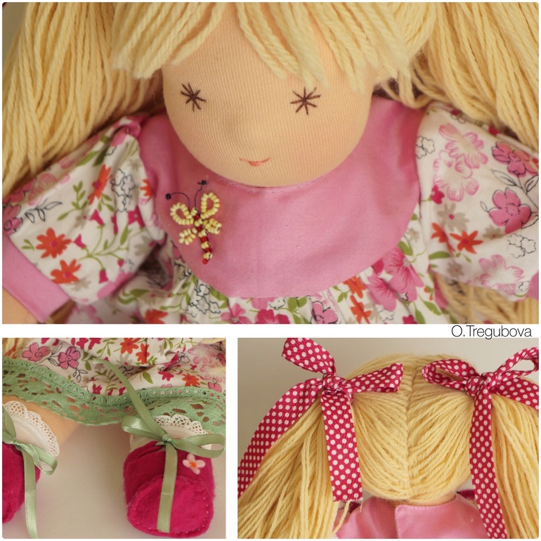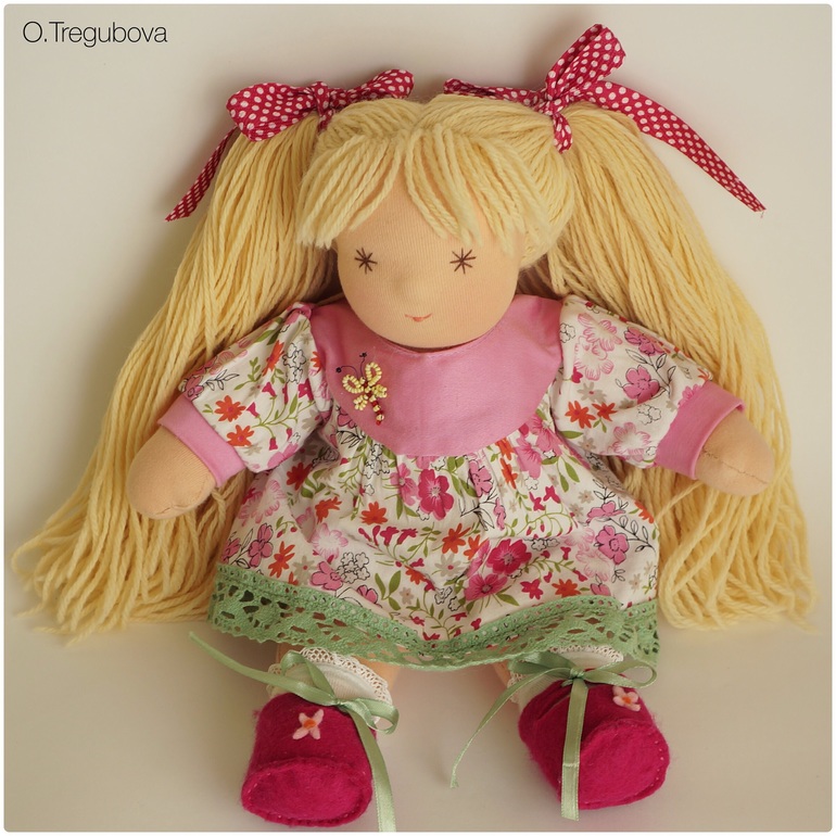 Девчушка сделана в полном соответствии "вальдорфских кукол". Волосики вшиты-вышиты, благодаря этому можно делать различные прически и дергать за волосики, сколько хочется, они остануться на месте :)))) Вообще вальдорфские куклы очень прочно делаются, чтобы смогли выдержать любую игру деток.