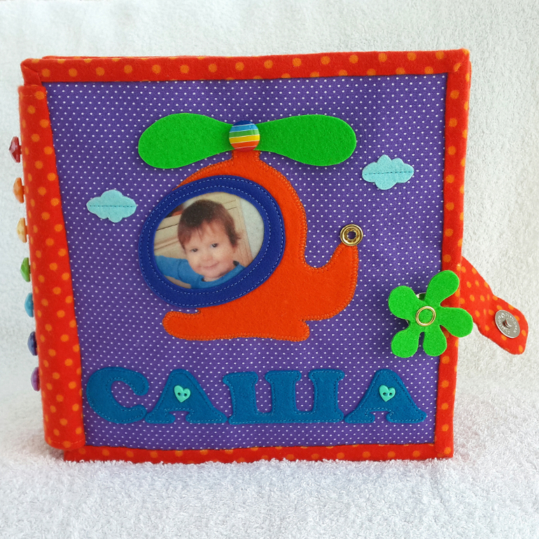Обложка - вертолет с фотомордочкой. Пропеллер на пуговке пришит, хвостовой на кнопке - можно покрутить и отстегнуть.