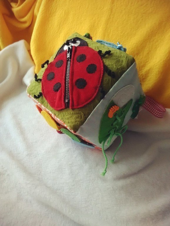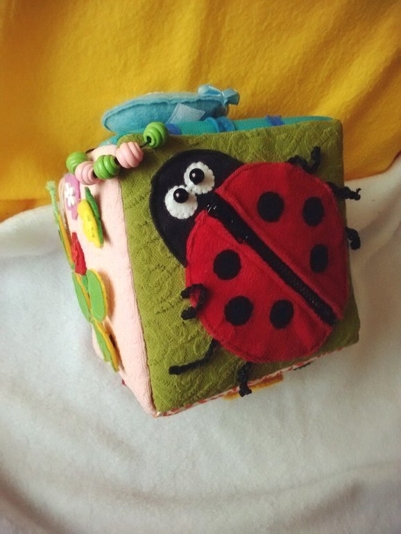 Кубик получился 15*15 см ( примерно), набит синтепоном. Божья коровка на молнии))