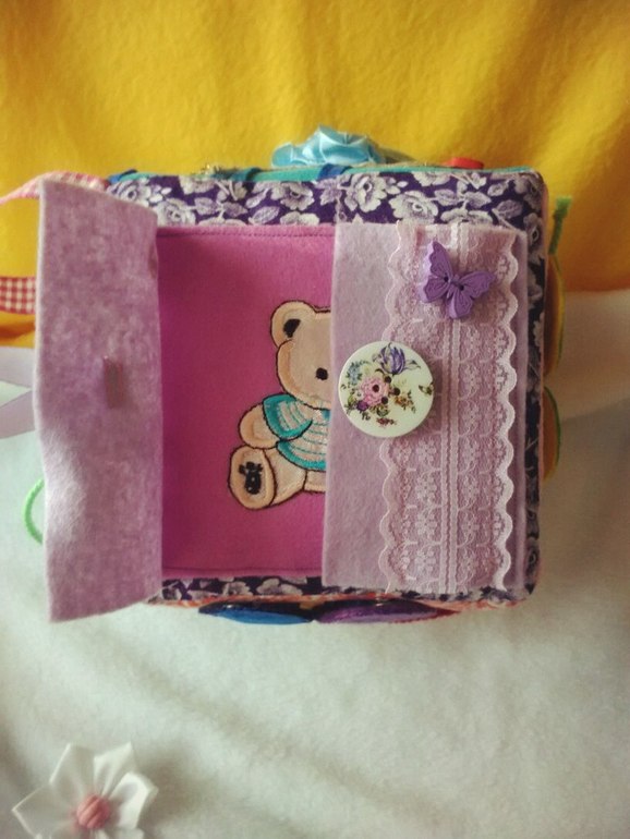 Так как кубик делался для принцессы, а фантазии у меня явно не хватает, я решила сделать одну сторону чисто девчачьей))) Кружево, бабочки, цветочки, ну и пуговка
