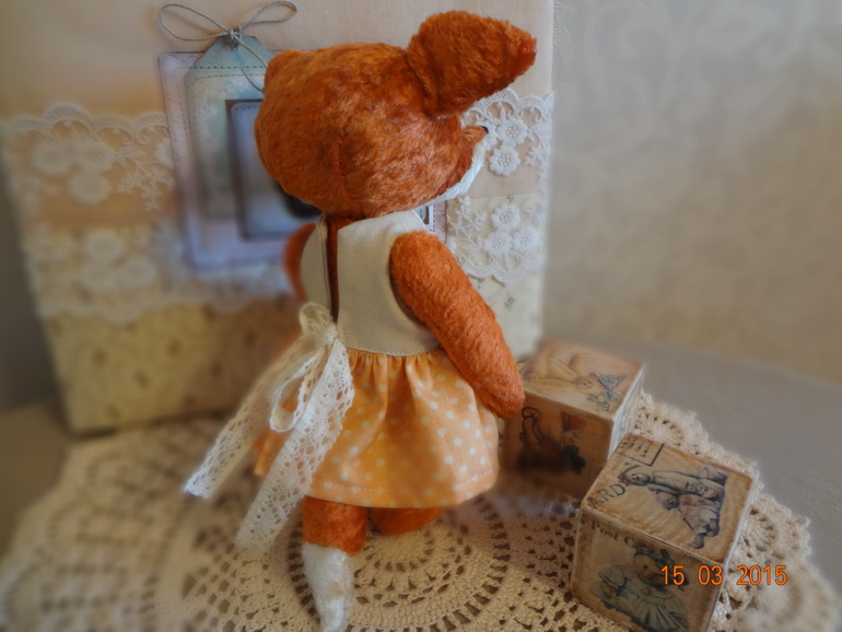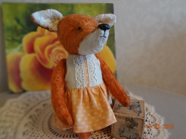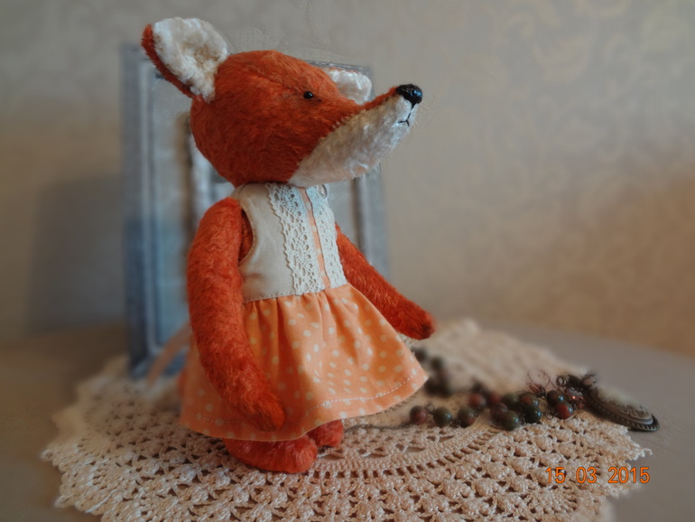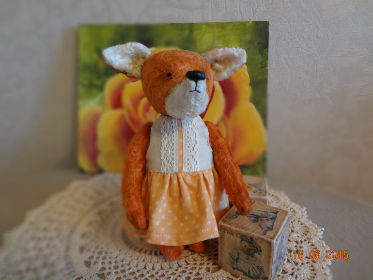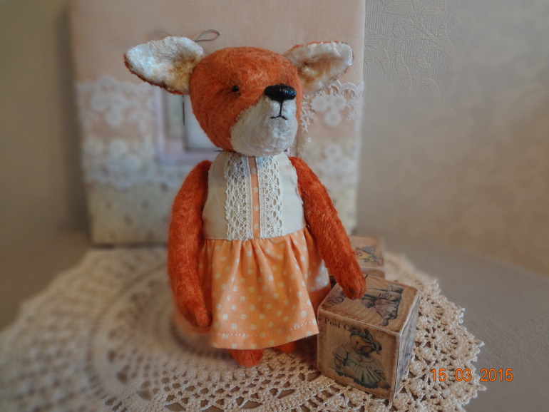 Игрушечный мир - животныеЛисичка сшита из винтажного плюша.Ростиком 19см Набита плотно древесными опилочками,утяжелена стальным гранулятом,тяжеленькая,приятно держать в ручках.Шплинтовое крепление. Глазки стекло.Носик блестит. Одета Лисичка в хлопковое платье,украшенное кружевом.Платье съемное,сзади завязывается на кружевной бантик. Лисичка сшита полностью вручную с большим удовольствием и любовью.