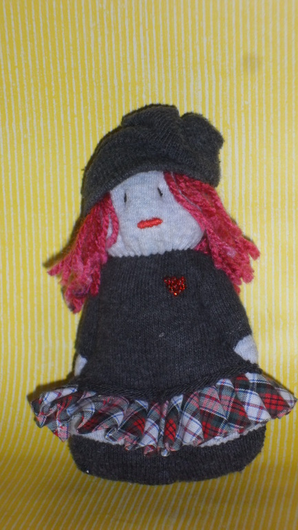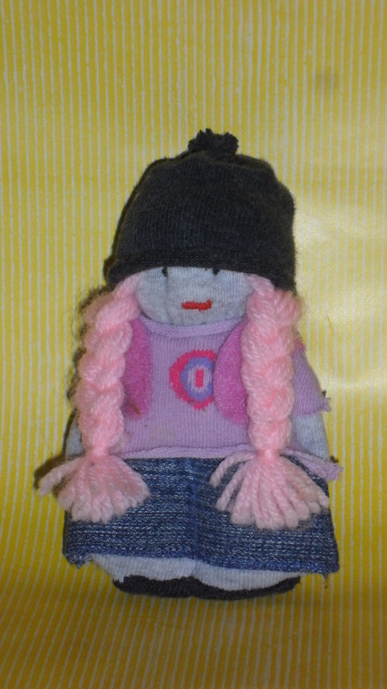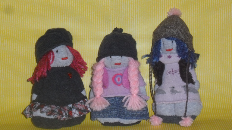 Есть у меня коробка, в которую складываются вещи для починки. Где-то пуговицу нужно пришить, где-то молнию заменить. Вот пришло время ими заняться. Подошла ко мне Эвелинка, смотрела, смотрела и говорит : "а сшей мне, мама, куколку". Сначала я и не собиралась этого делать. А потом попались колготки детские и решила я порадовать ребенка. Ну что стоит сшить ляльку. Ребенок рад. Следующий заказ поступил от Леончика на куколку-мальчика.... И как-то я втянулась. В ход пошли колготки, носки, всякие лоскутки. Первенцы катаются с детьми в машине. А это их преемники : девчонки-модницы :)