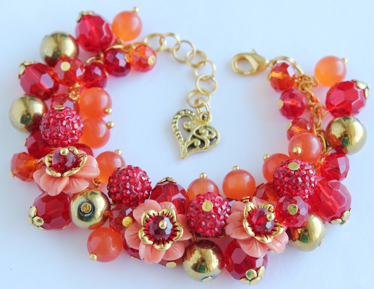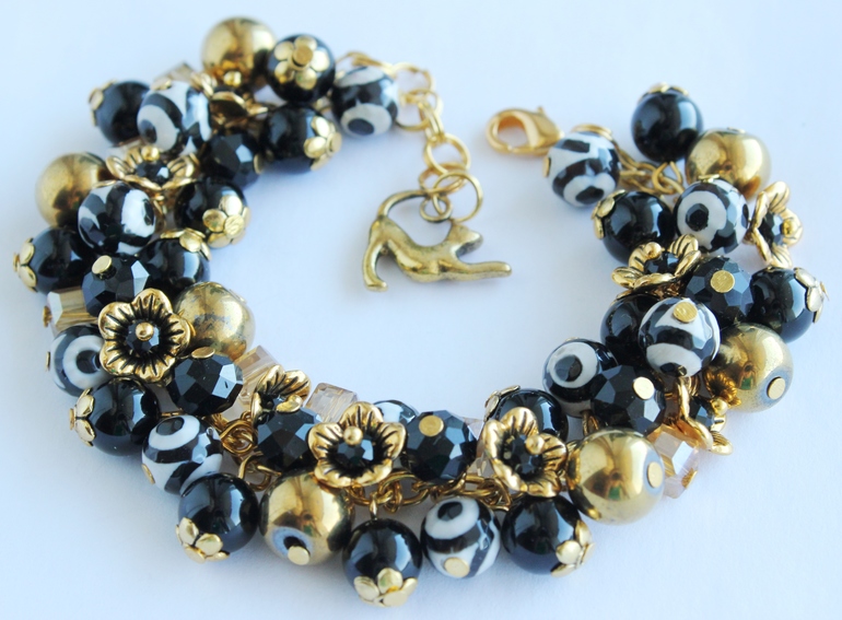 3) Браслет выполнен из гематита, кошачьего глаза, стразовых бусин, гранёных бусин, акриловых цветочков и фурнитуры под золото.