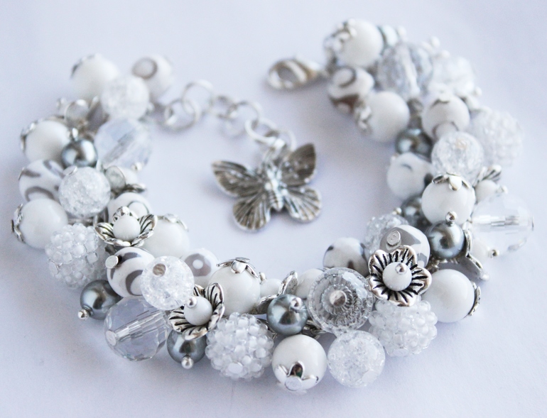 5) Браслет выполнен из бусин, оплетённых чешским бисером, агата, агата дзи, кварца фрост, жемчуга майорка, гранёных бусин и фурнитуры под серебро.