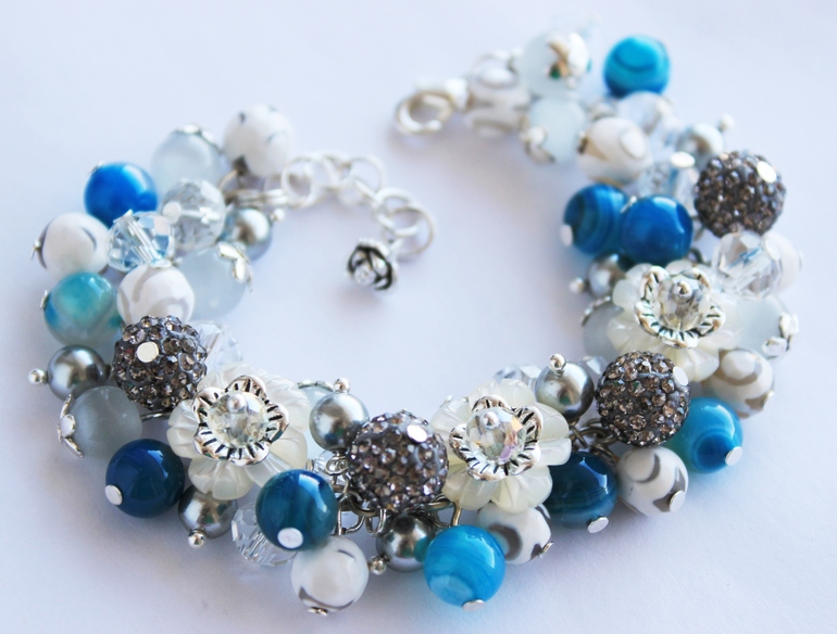 2) Браслет выполнен из агата, перламутровых цветков, агата дзи, кошачьего глаза, стразовых бусин, жемчуга майорка, гранёных бусин и фурнитуры под серебро.